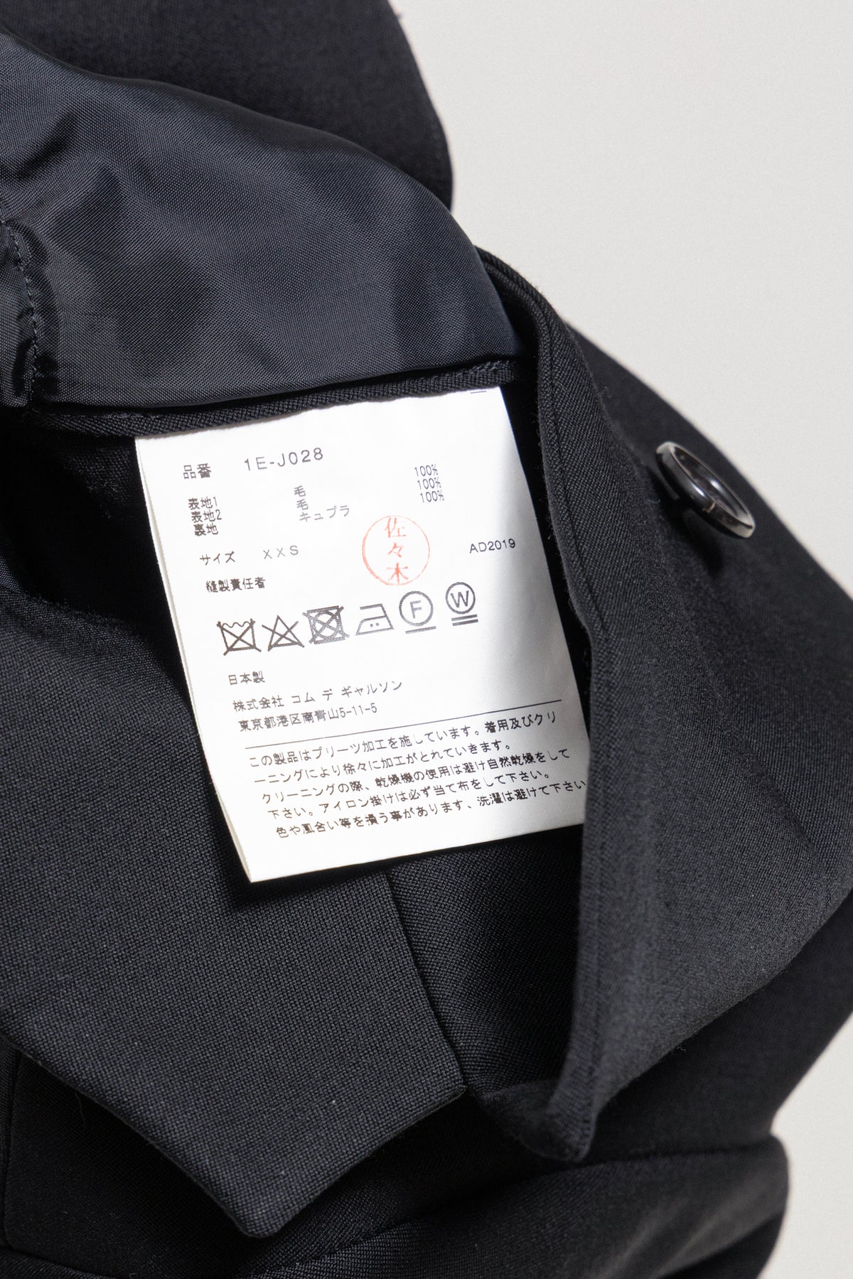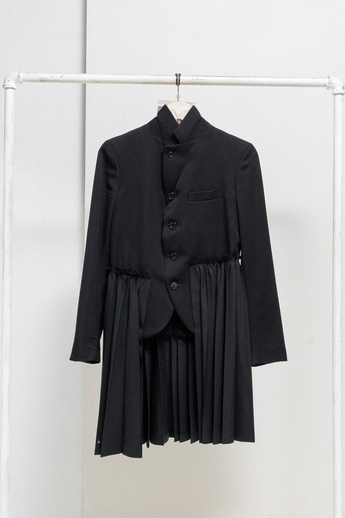 Beautiful jacket made of soft wool fabric, featuring a traditional tailor collar that closes at front using five buttons and skirt like pleated panel sewn around the waist detailed with frayed edges. Chest pocket. Cuff splits with three buttons. No shoulder pads. Black half lining on the inside.