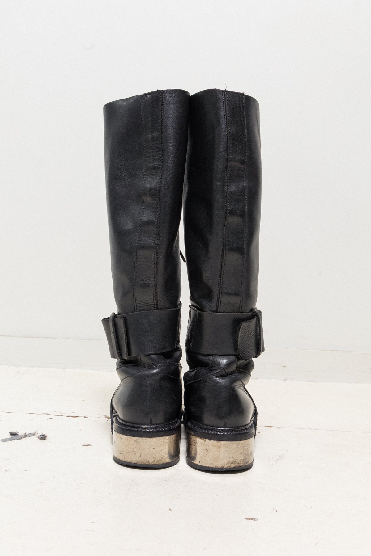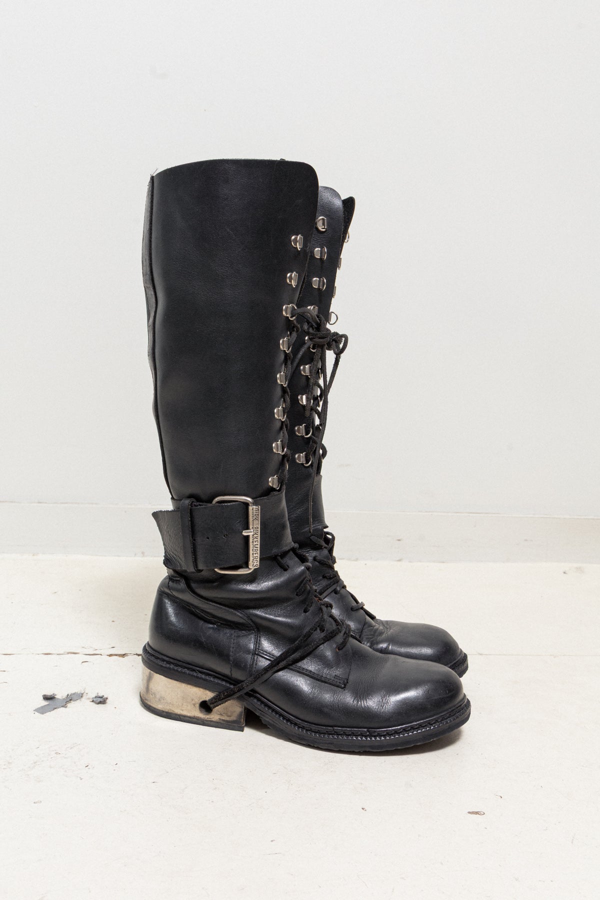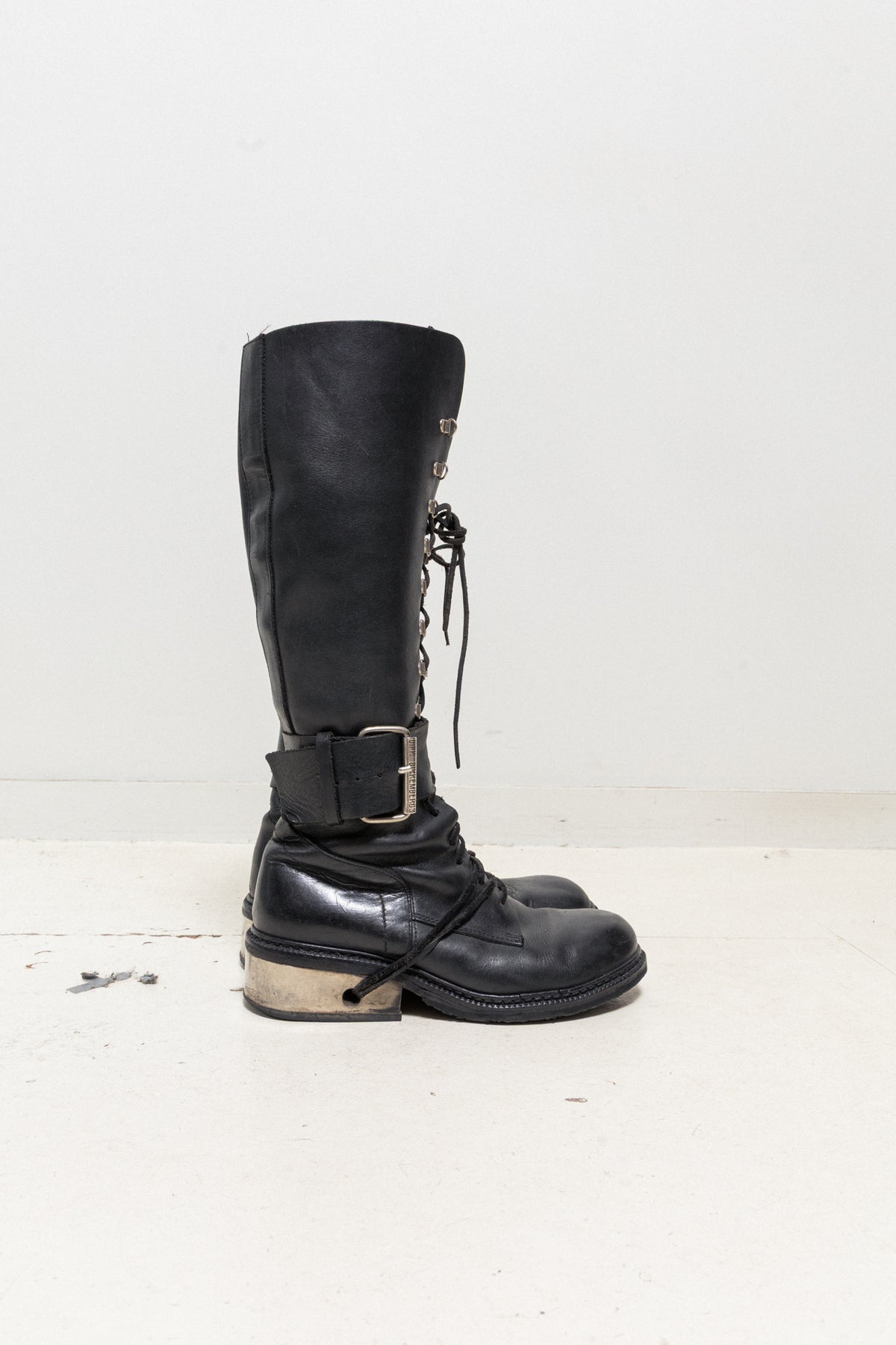 Amazing knee-high leather boots, featuring a chunky metal heel with a hole to slide the laces through. Long leather laces with partial metal eyelets with buckles. Leather strap around the ankle with metal buckles. Rubber resole.