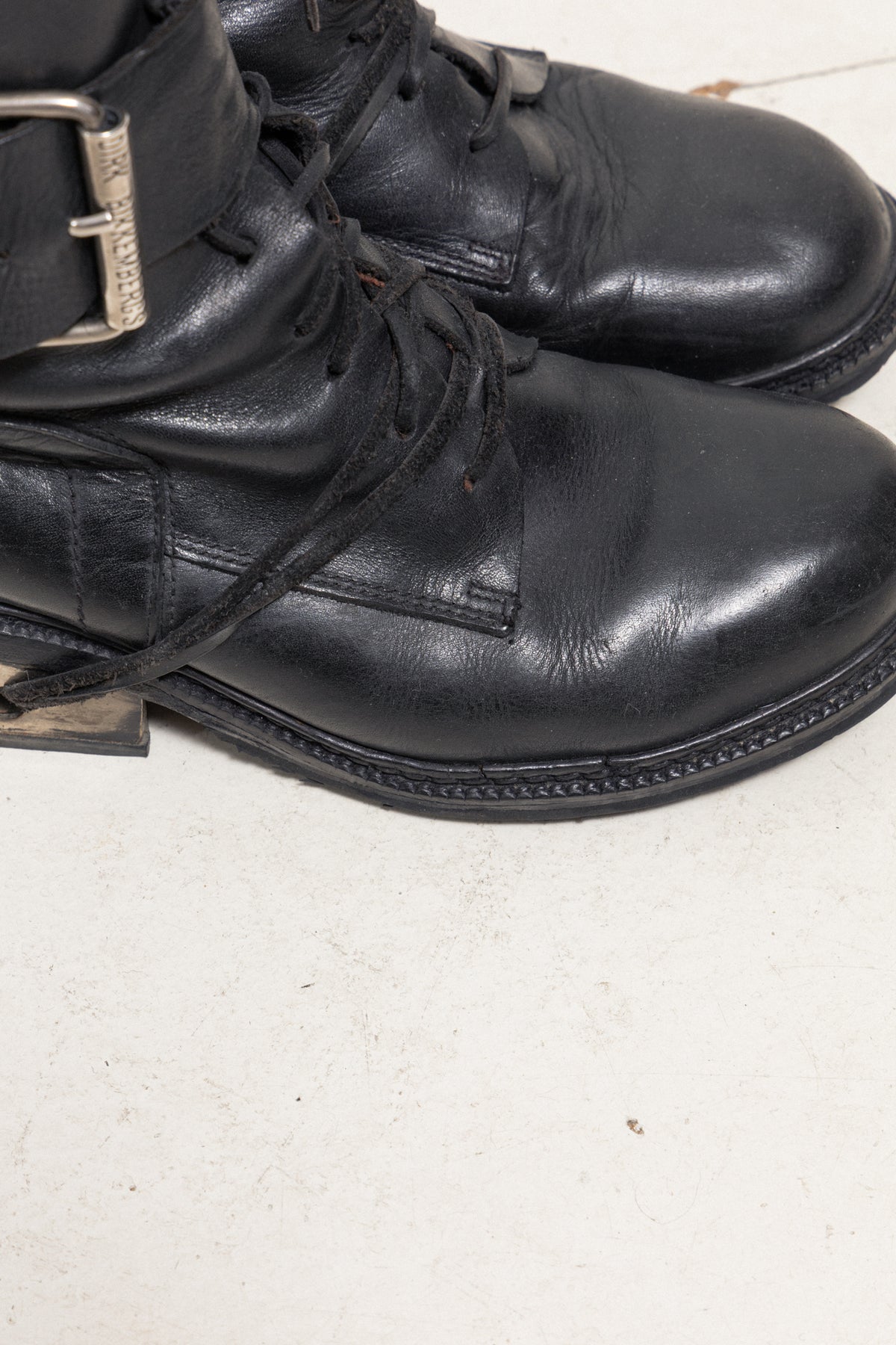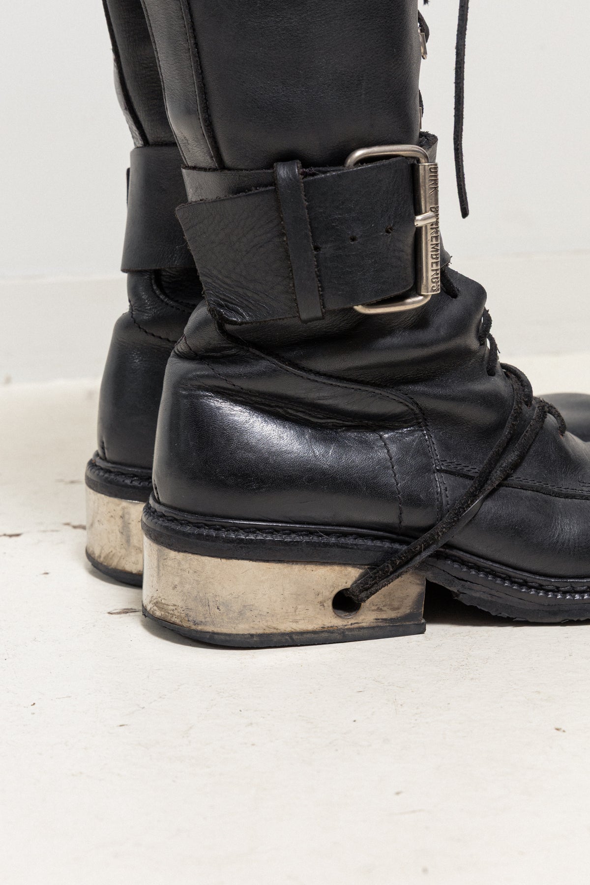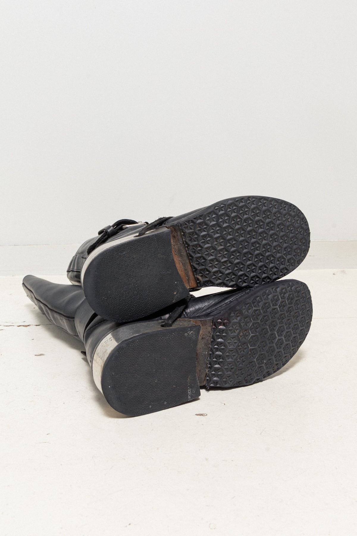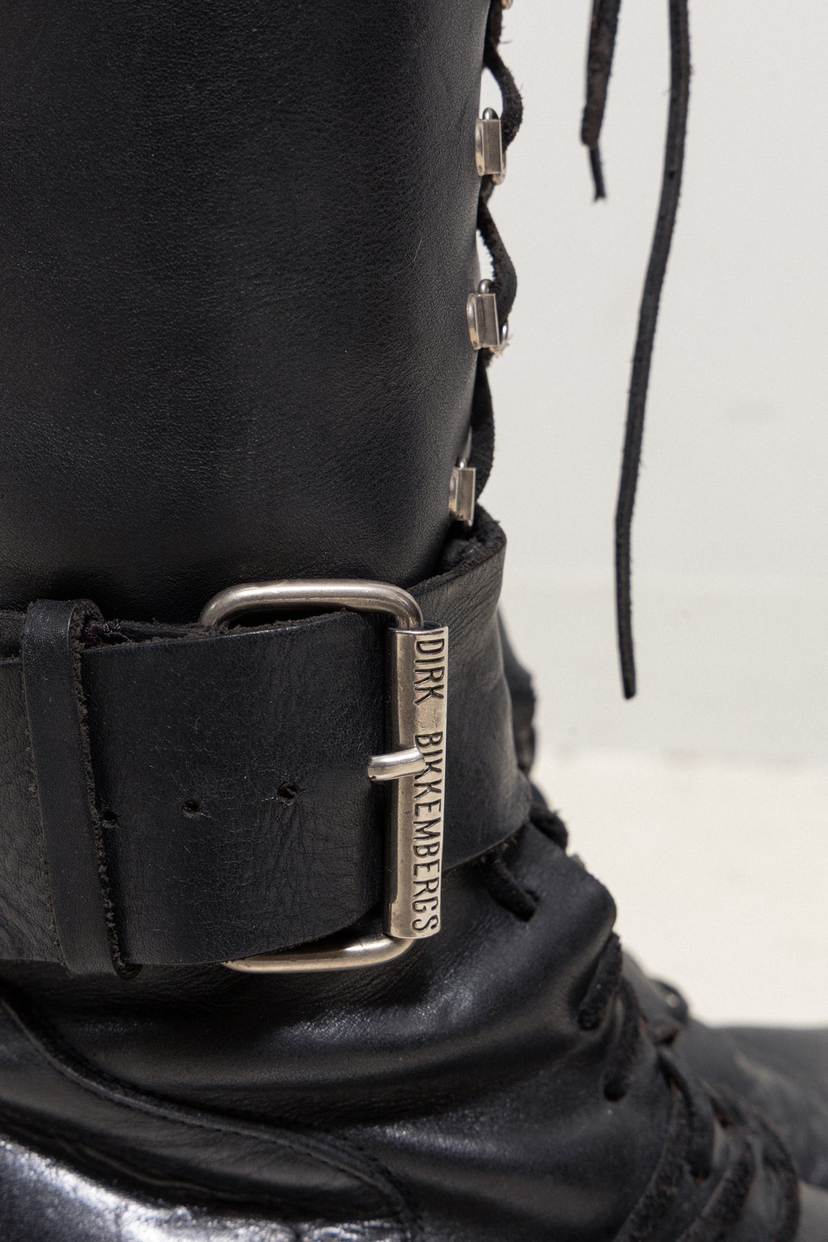 Amazing knee-high leather boots, featuring a chunky metal heel with a hole to slide the laces through. Long leather laces with partial metal eyelets with buckles. Leather strap around the ankle with metal buckles. Rubber resole.