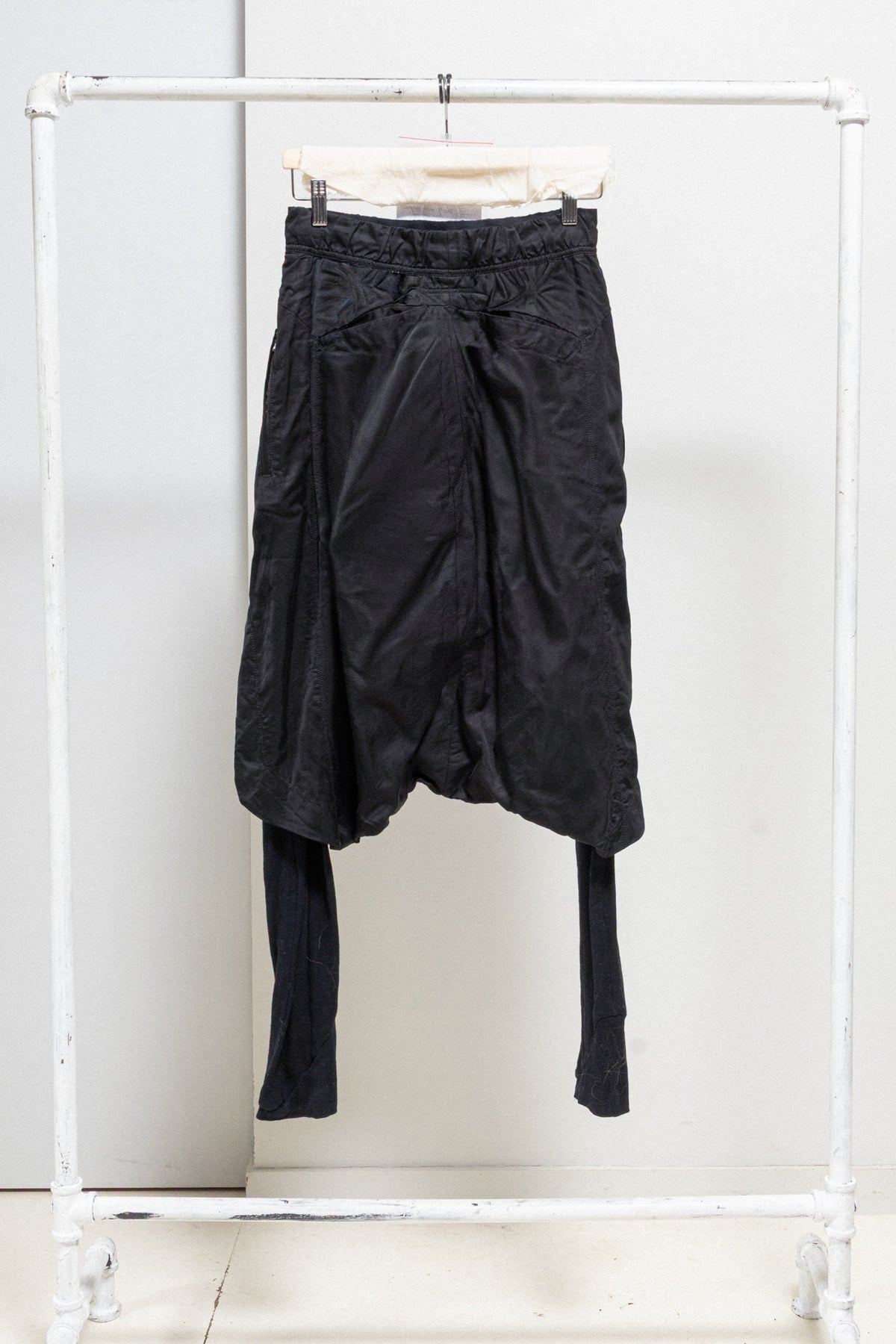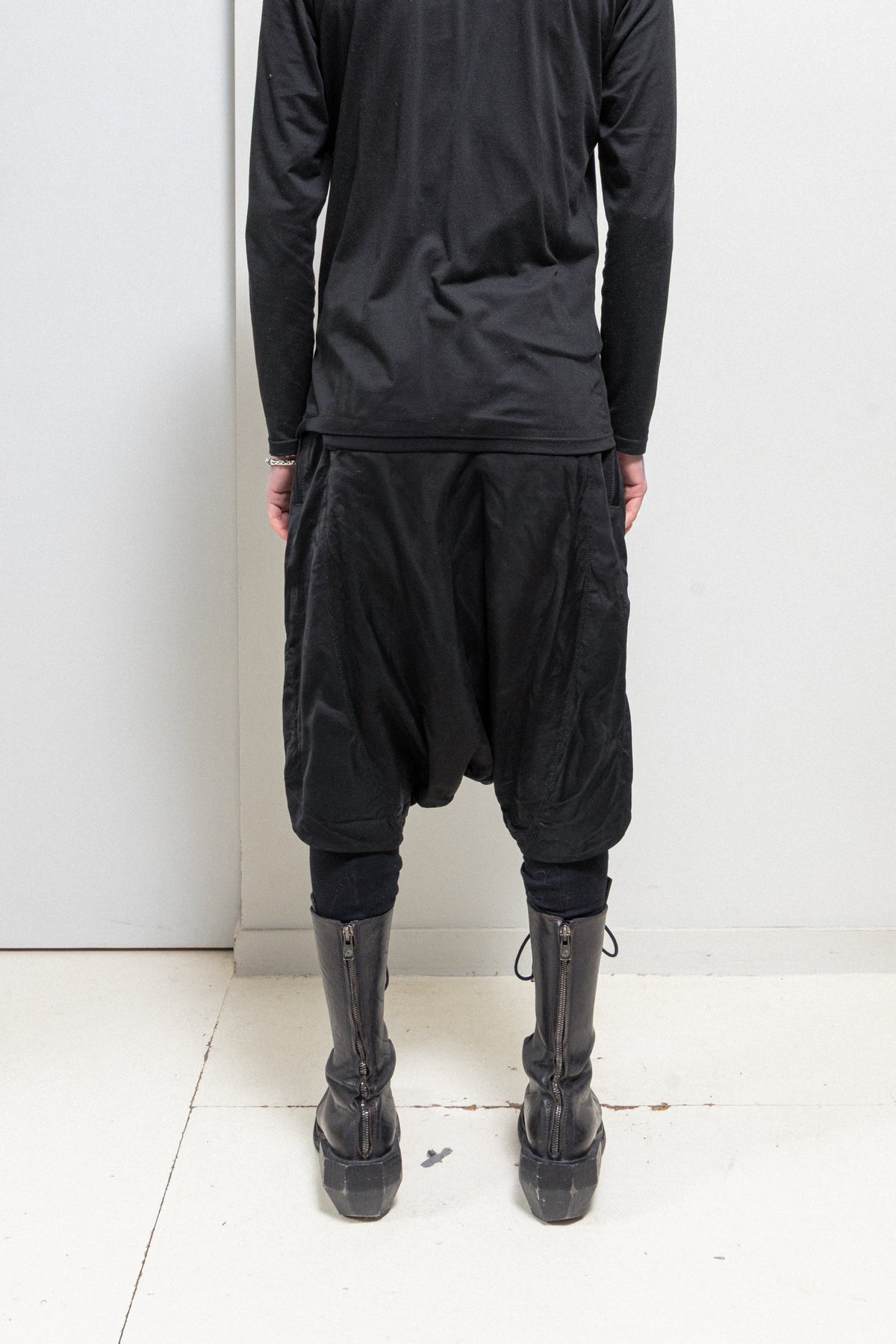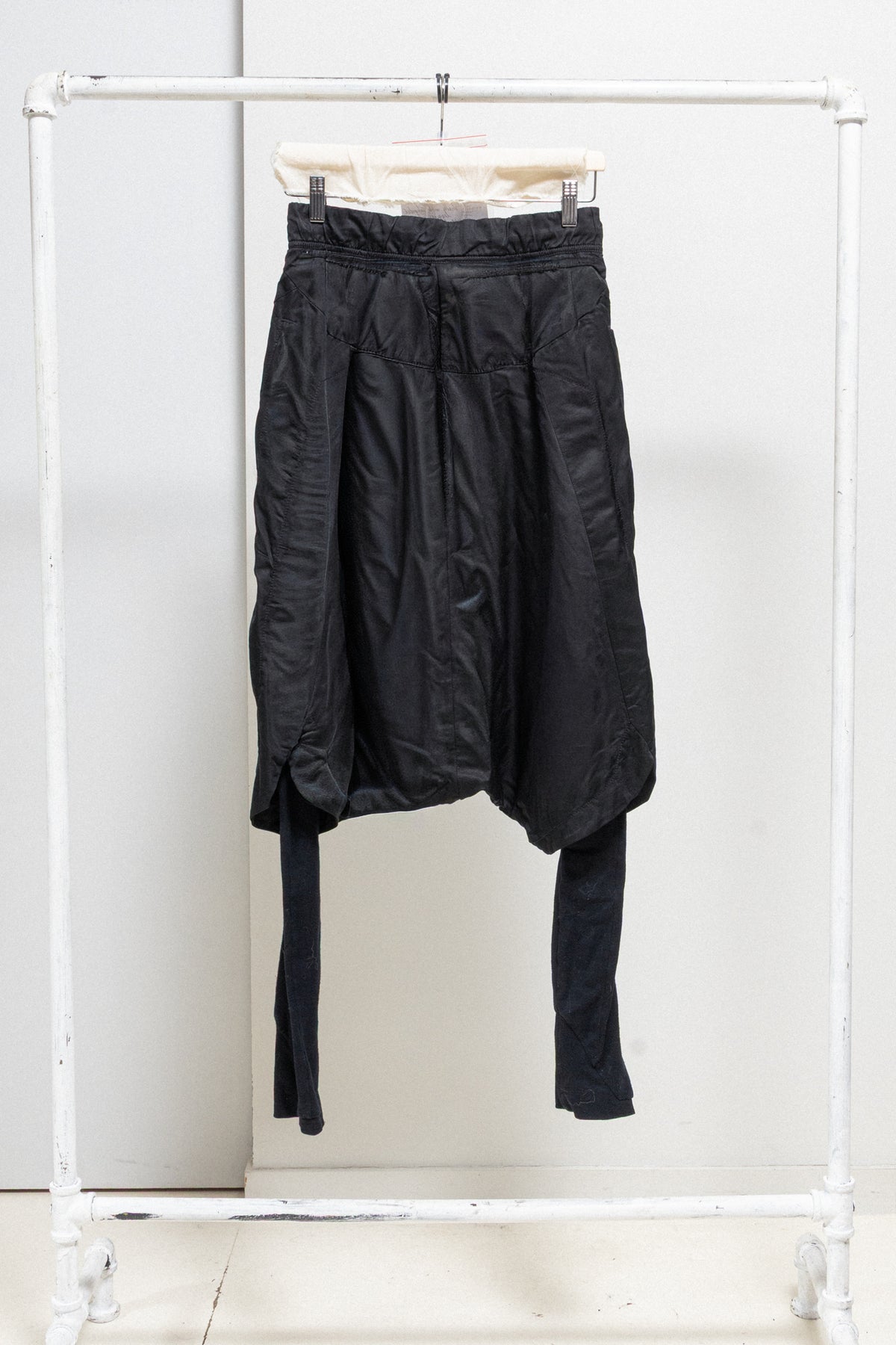 Beautiful pair of drop crotch shorts made of a shiny and light nylon fabric, featuring an integrated tight legging underlayer that starts being visible at the knees. Elastic waist. Front fly with a metal zipper. Side zip up pockets. Detailed geometric panels and stitching on the front. Back seam pockets.