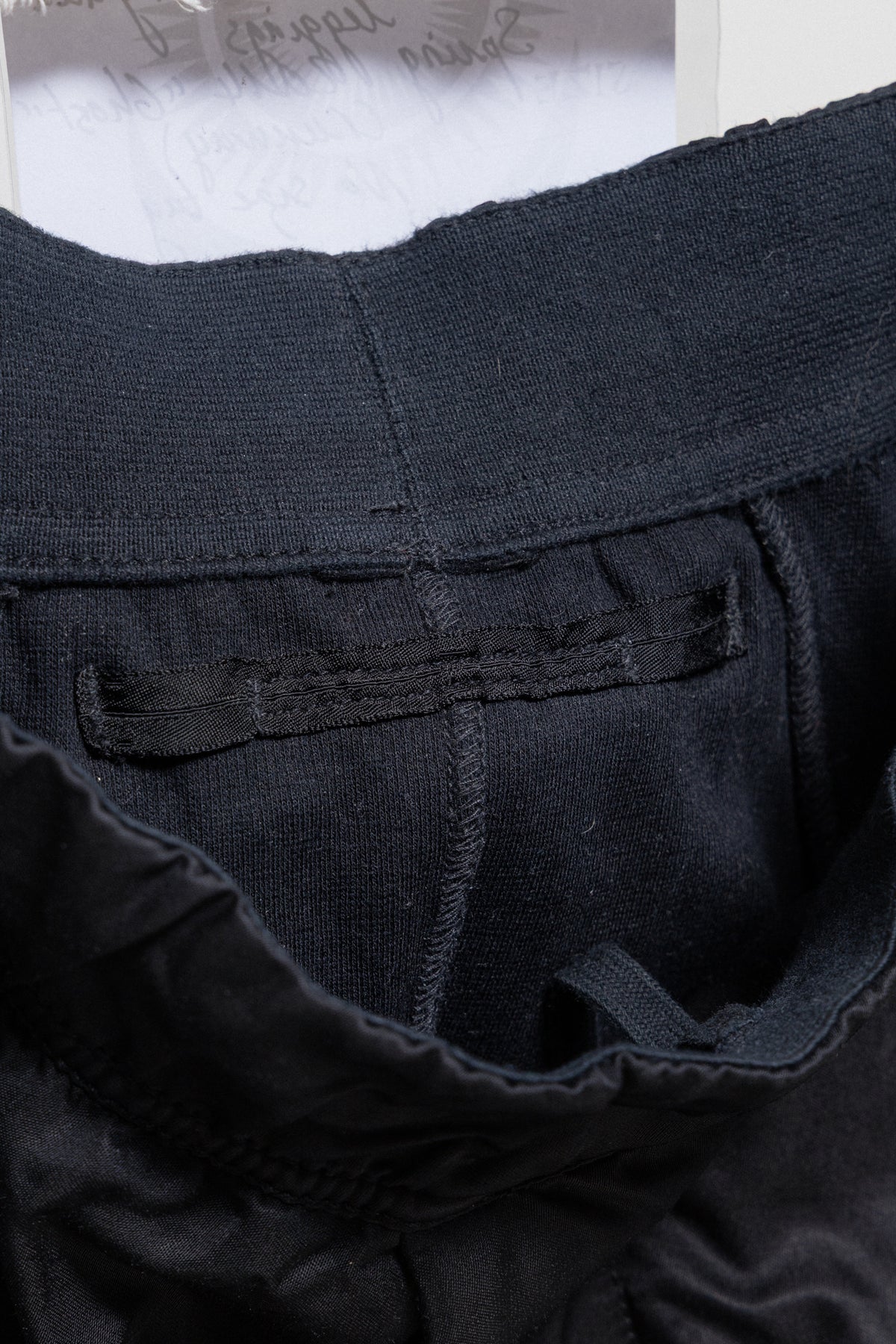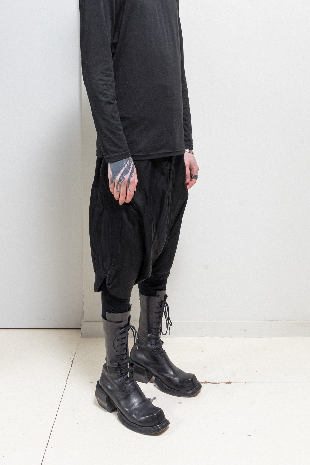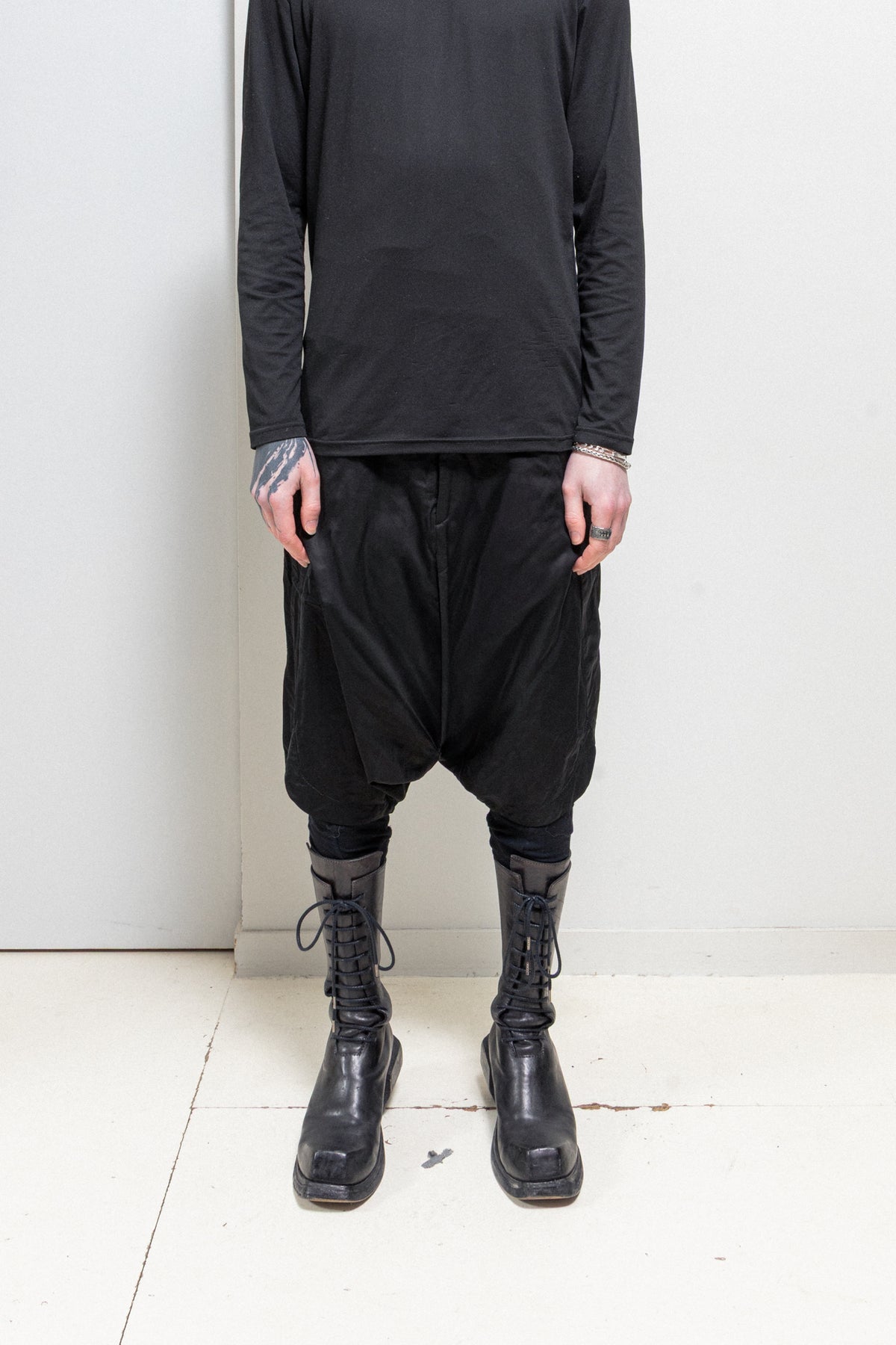 Beautiful pair of drop crotch shorts made of a shiny and light nylon fabric, featuring an integrated tight legging underlayer that starts being visible at the knees. Elastic waist. Front fly with a metal zipper. Side zip up pockets. Detailed geometric panels and stitching on the front. Back seam pockets.