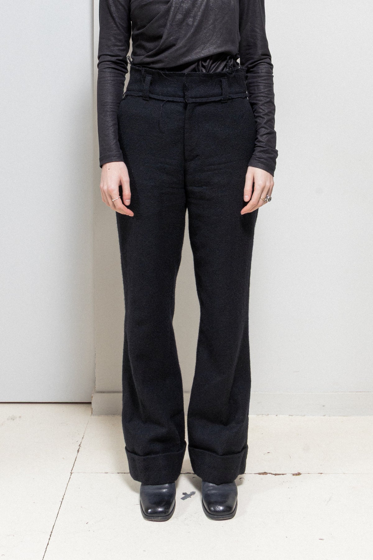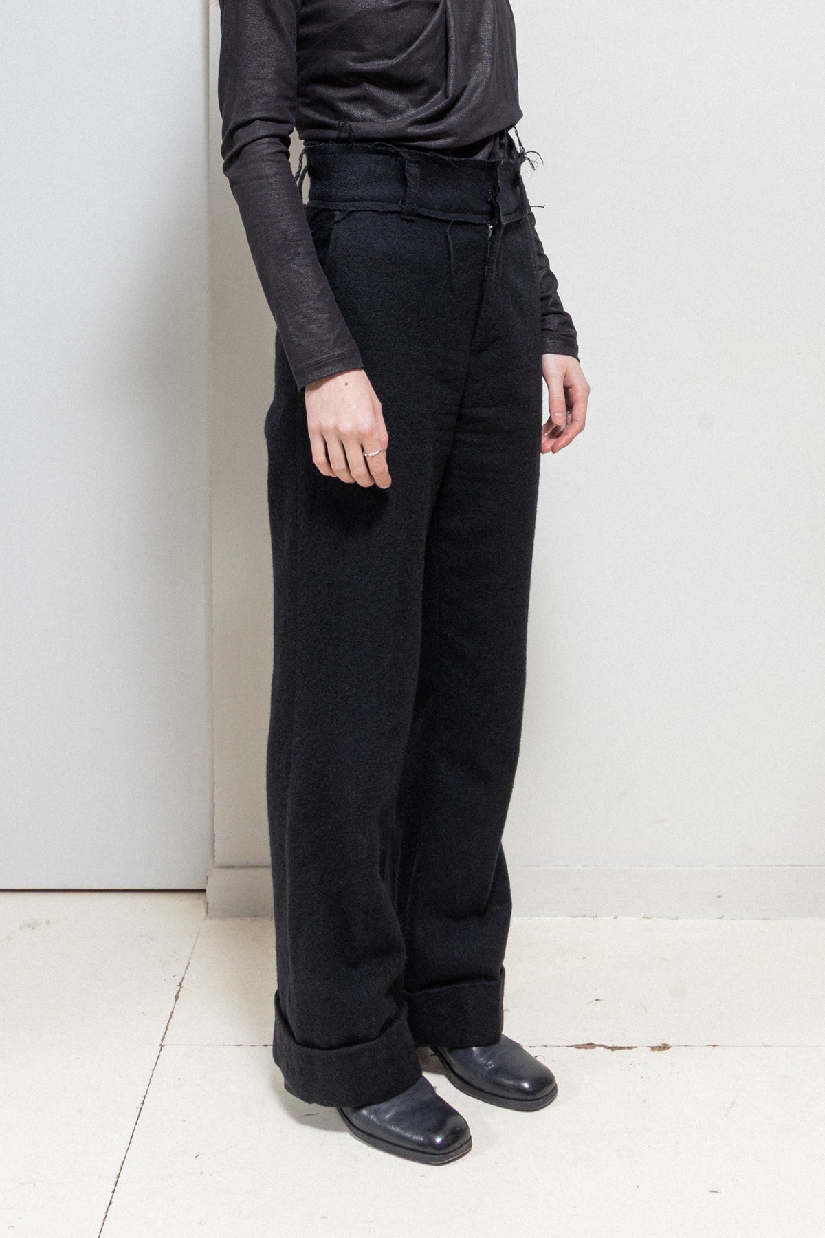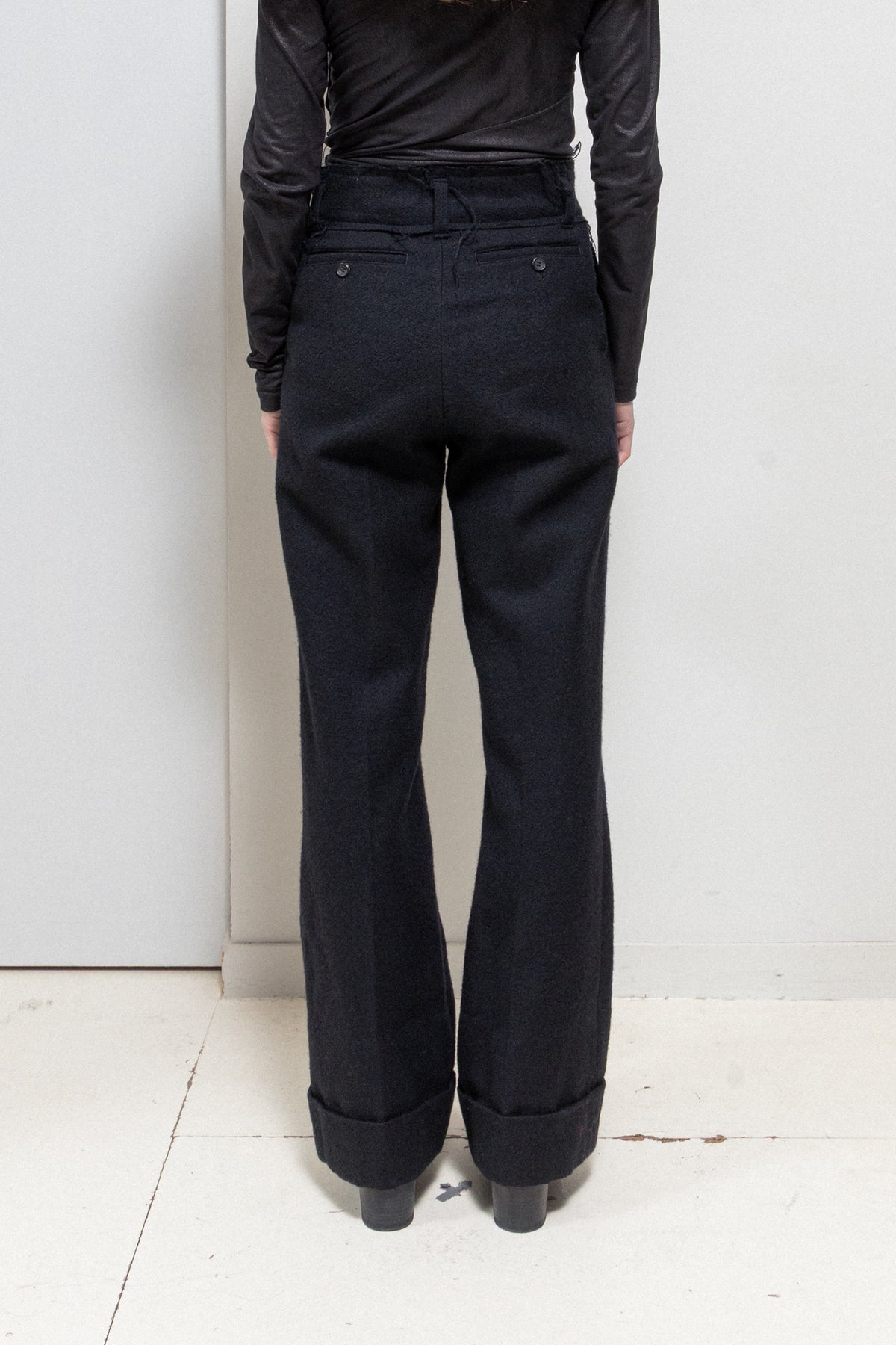 Beautiful pair of black wide pants made of thick wool fabric, featuring a large waist belt detailed by frayed seams and accessorized with belt loops. Front pockets. Front closure with metal staples and zipper. Back piped pockets with buttons. Large bottom hem.