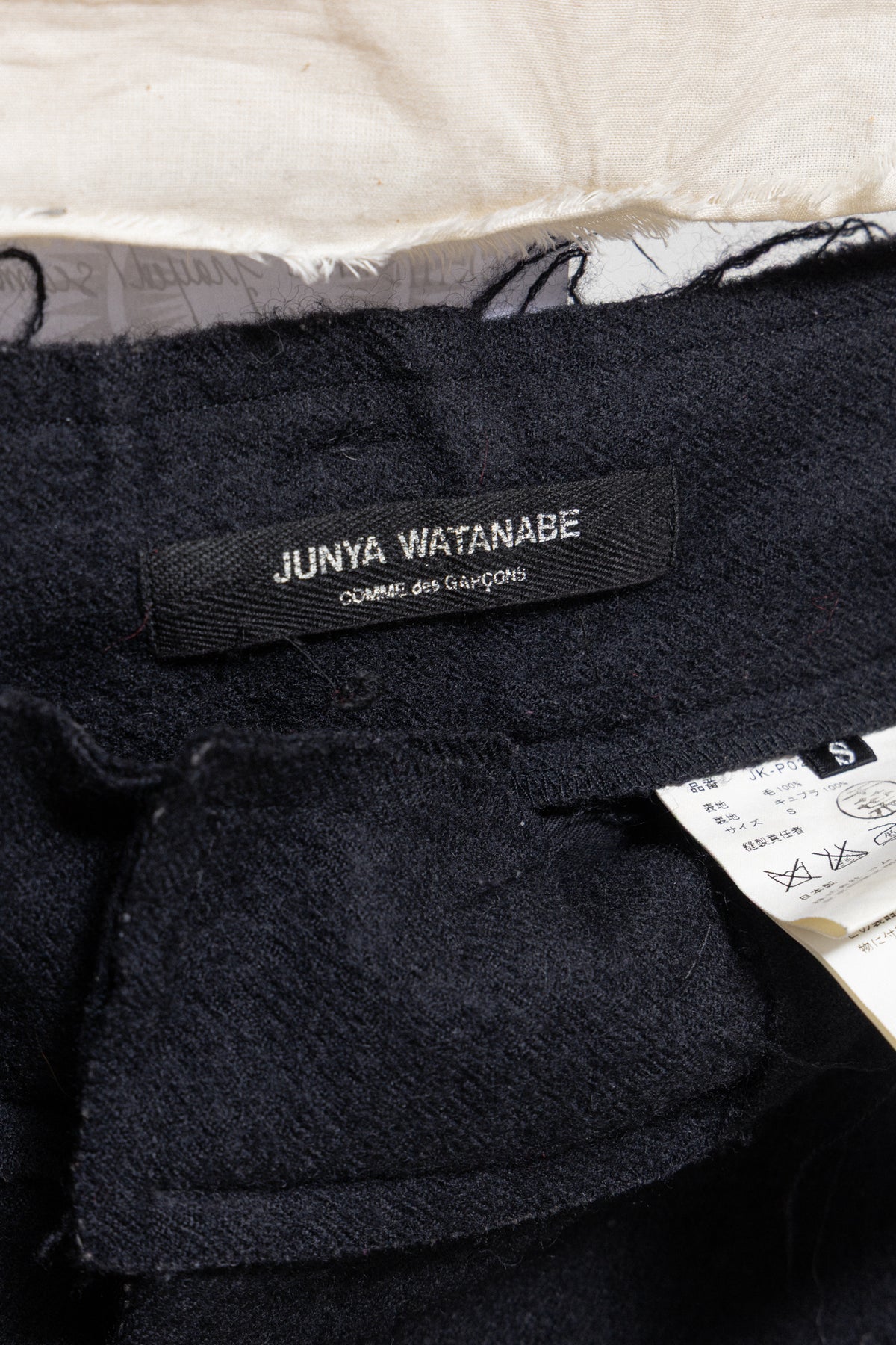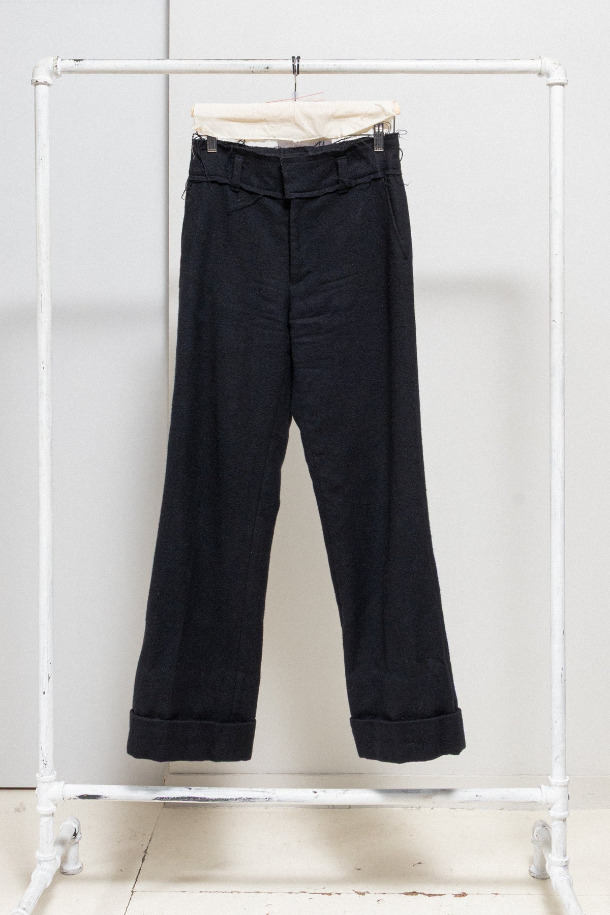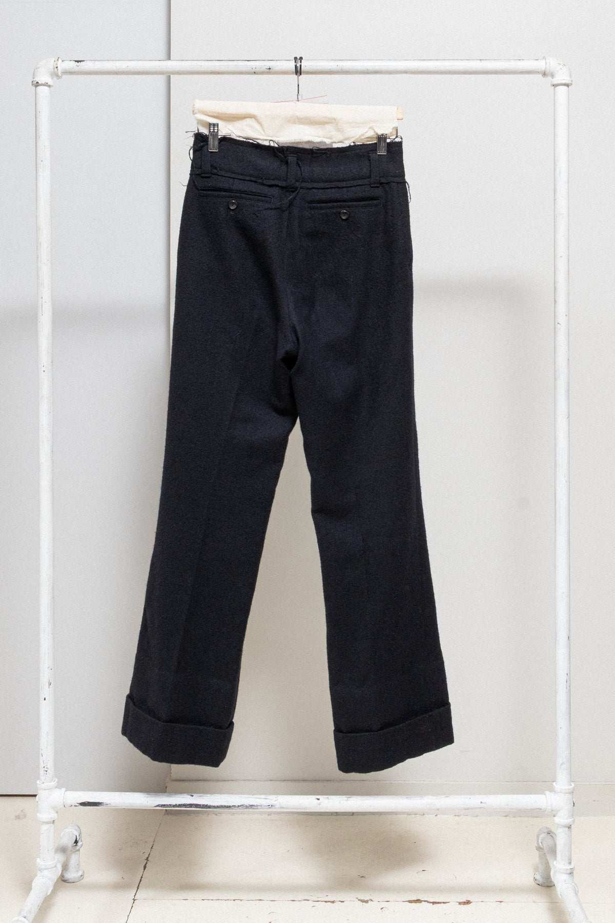 Beautiful pair of black wide pants made of thick wool fabric, featuring a large waist belt detailed by frayed seams and accessorized with belt loops. Front pockets. Front closure with metal staples and zipper. Back piped pockets with buttons. Large bottom hem.
