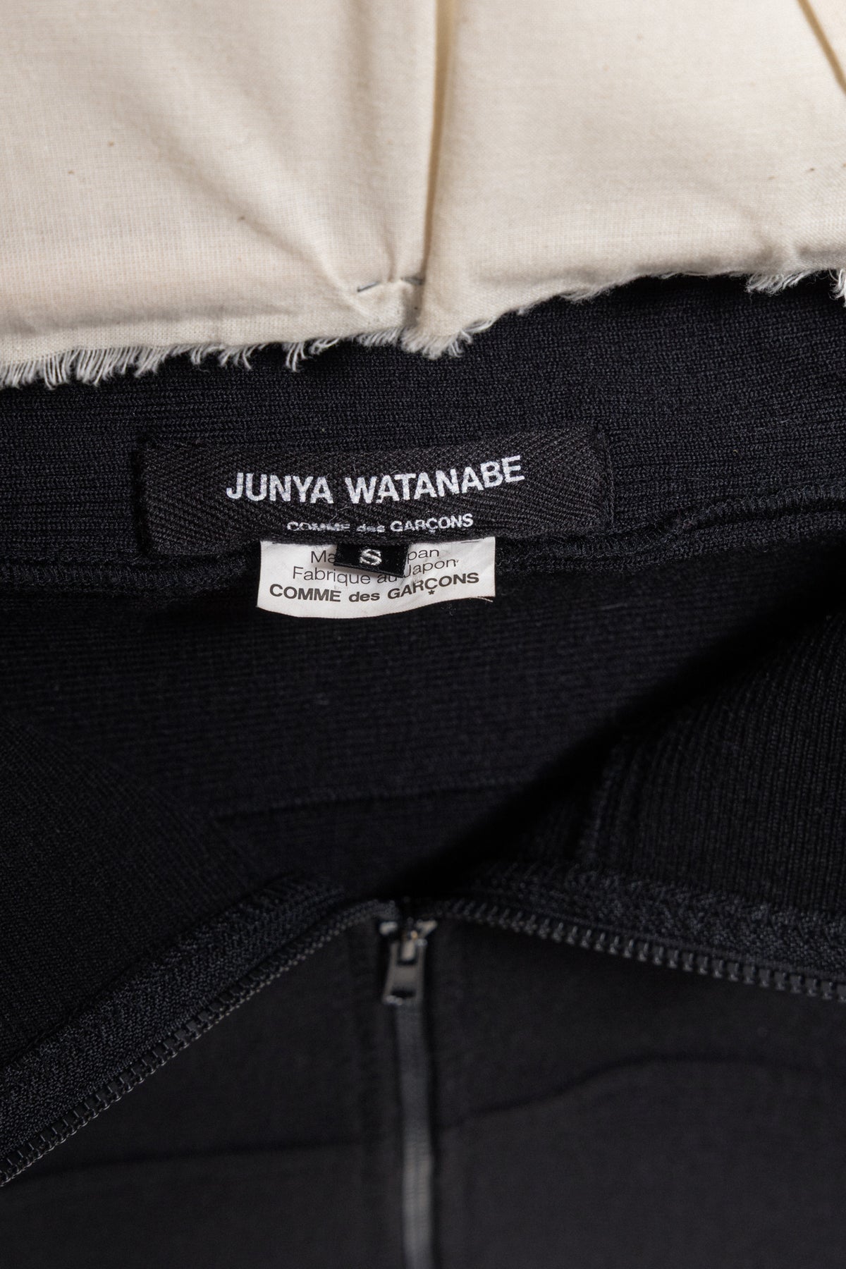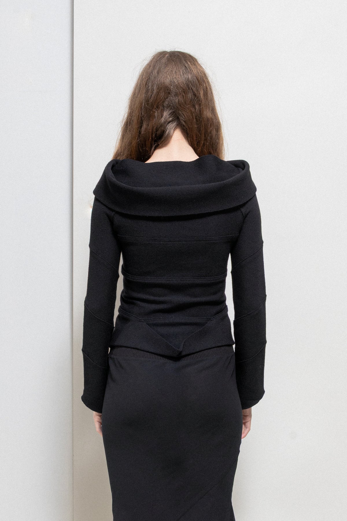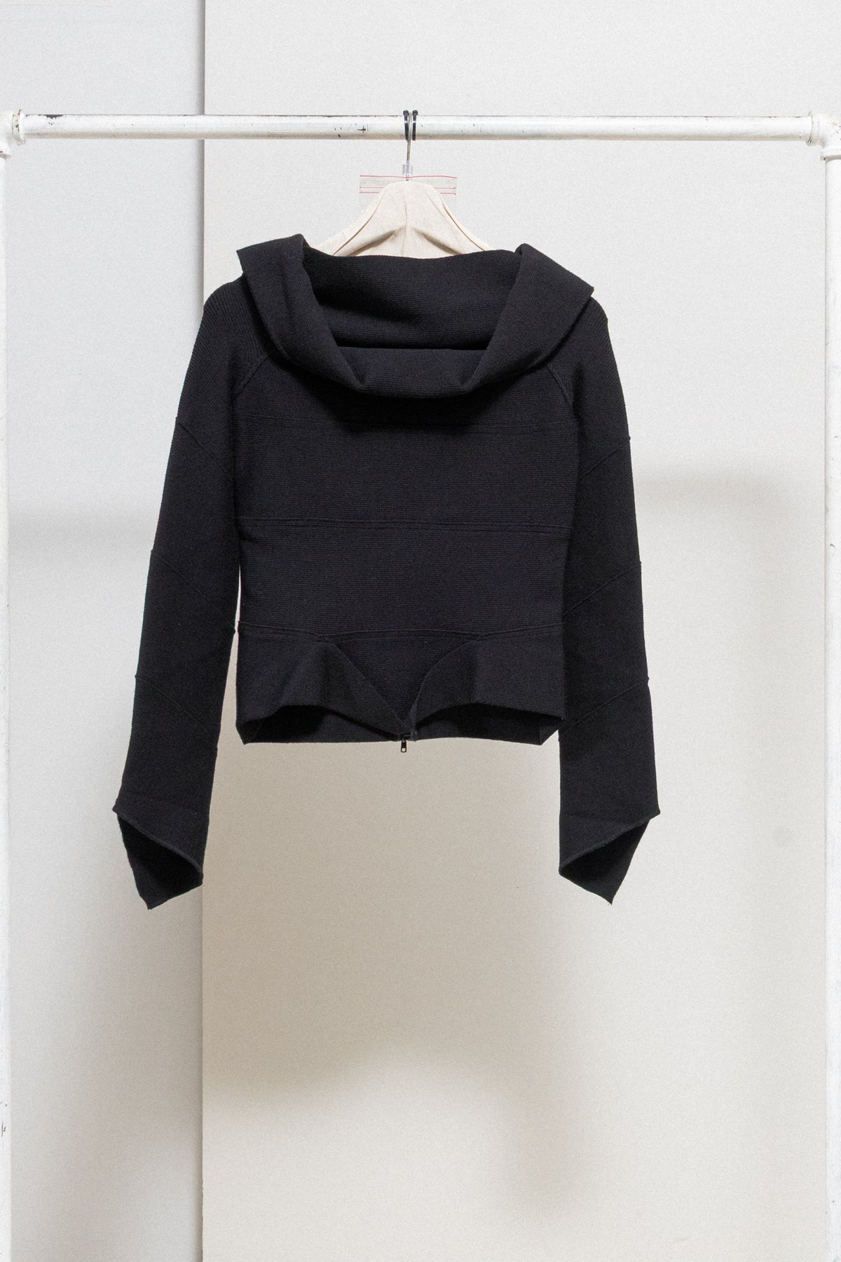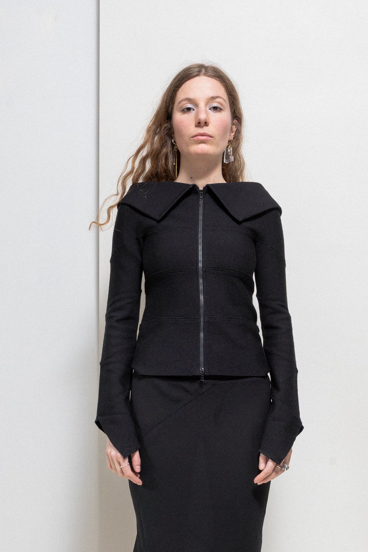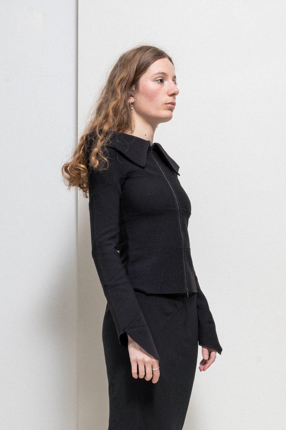 Beautiful jacket made of a thick ribbed and stretch fabric, featuring a front double zipper allowing to open it from both sides, as well as elongated sleeves with asymmetric cuffs covering hands. Sailor like folded collar falling on shoulders, back panels detail. Fitted cut.