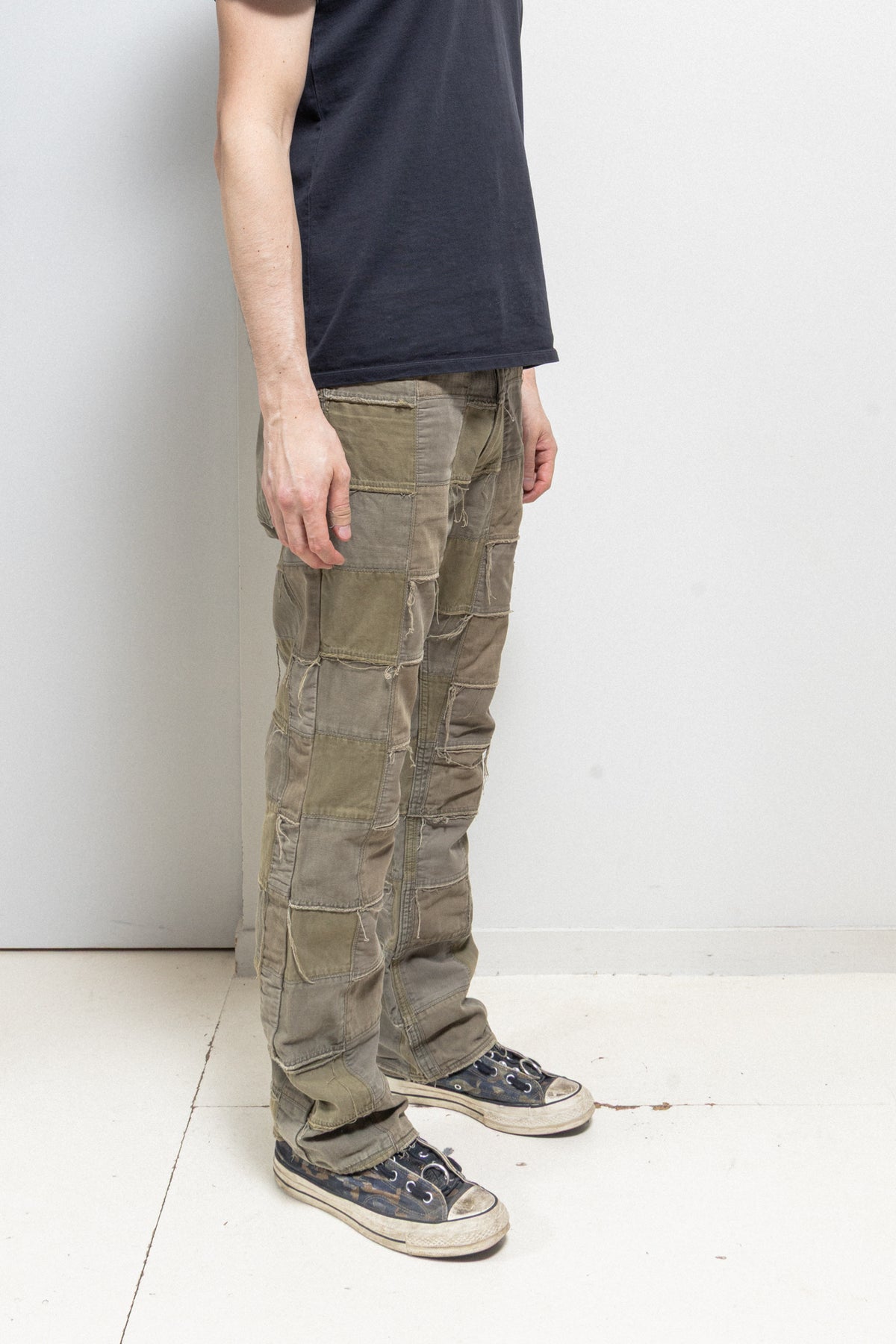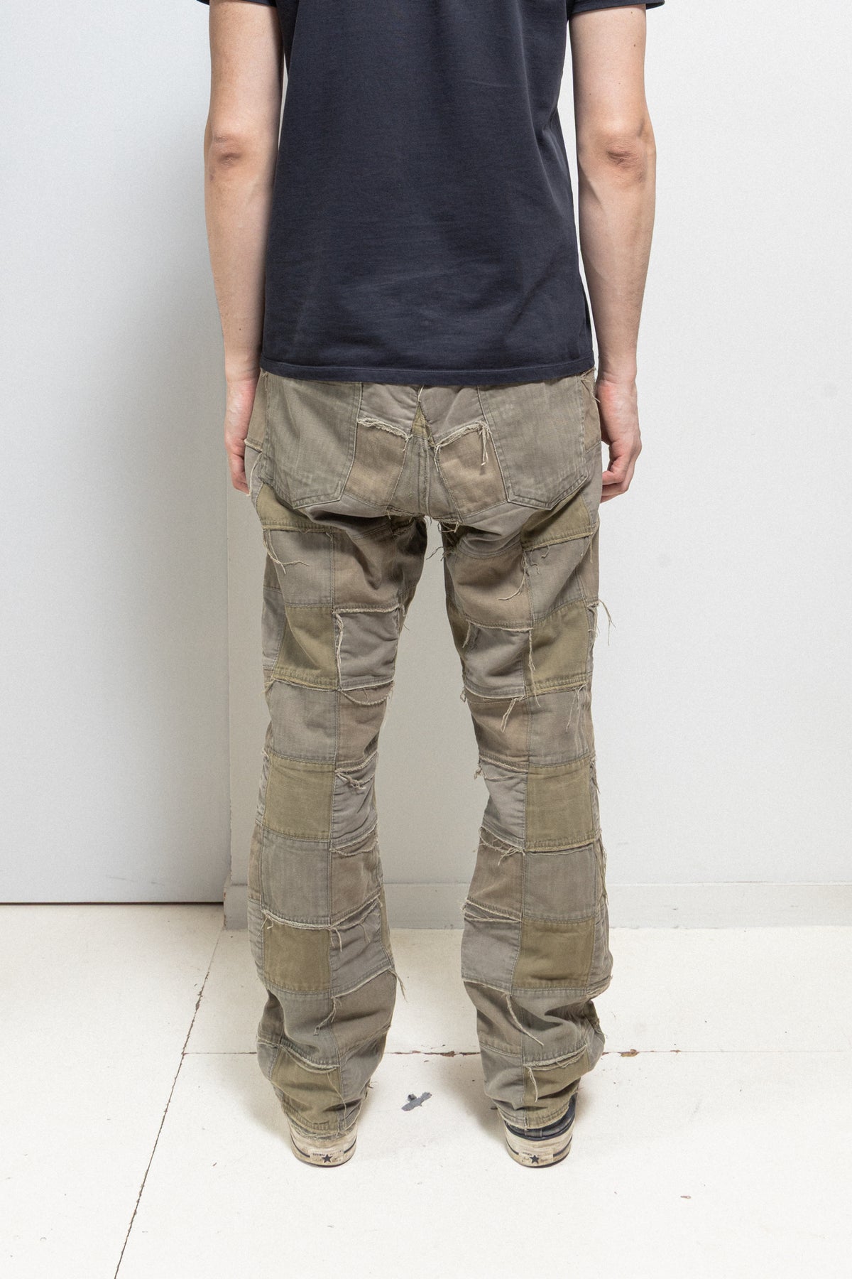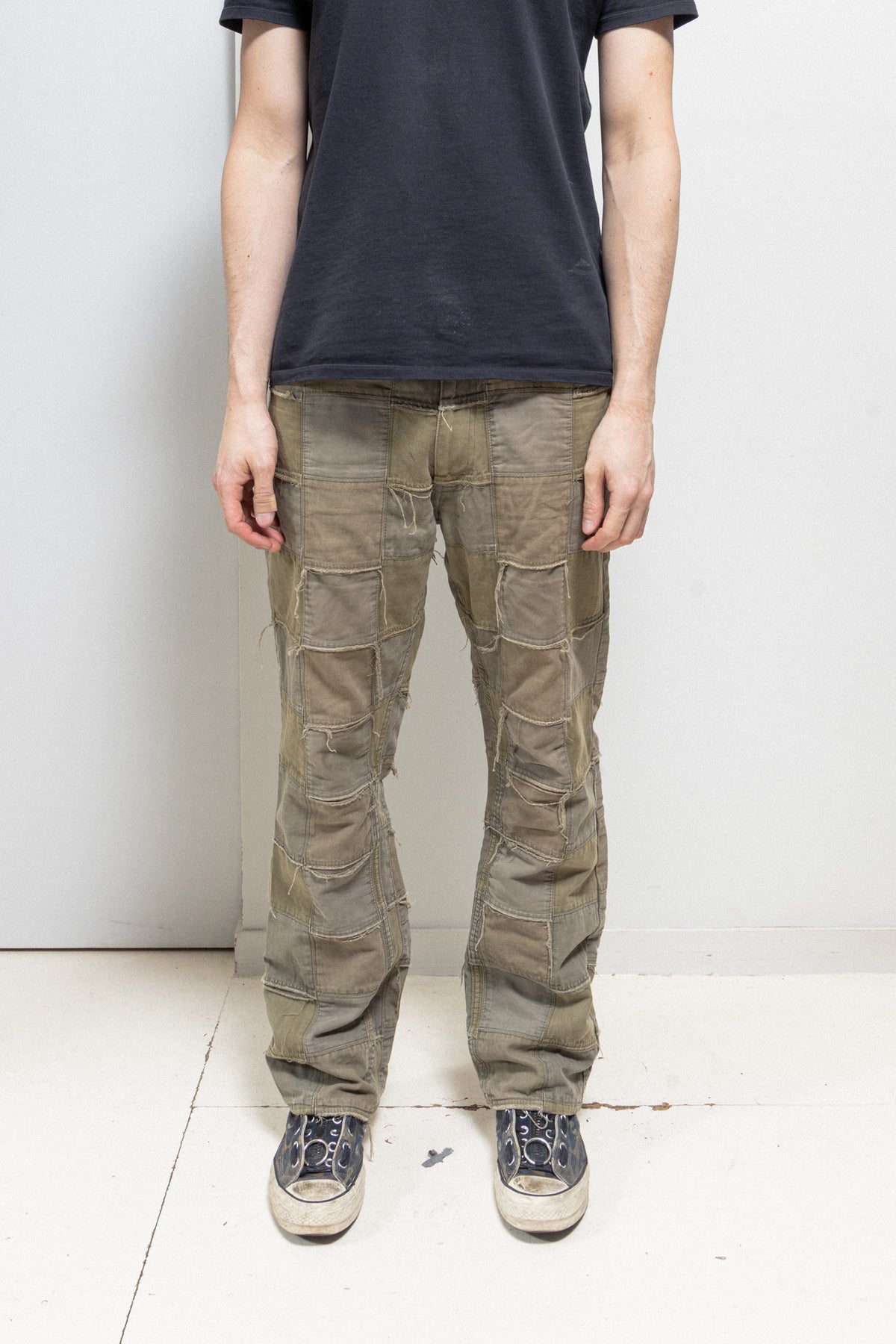 Beautiful khaki green cotton denim pants, featuring a heavily detailed work of patchwork that constructs the entirety of the garment legs with some of the patches sewn using a chevron pattern fabric. Frayed seams detail. Front closure with a metal zipper and a single button. Belt loops. Front pockets and back patch pockets.
