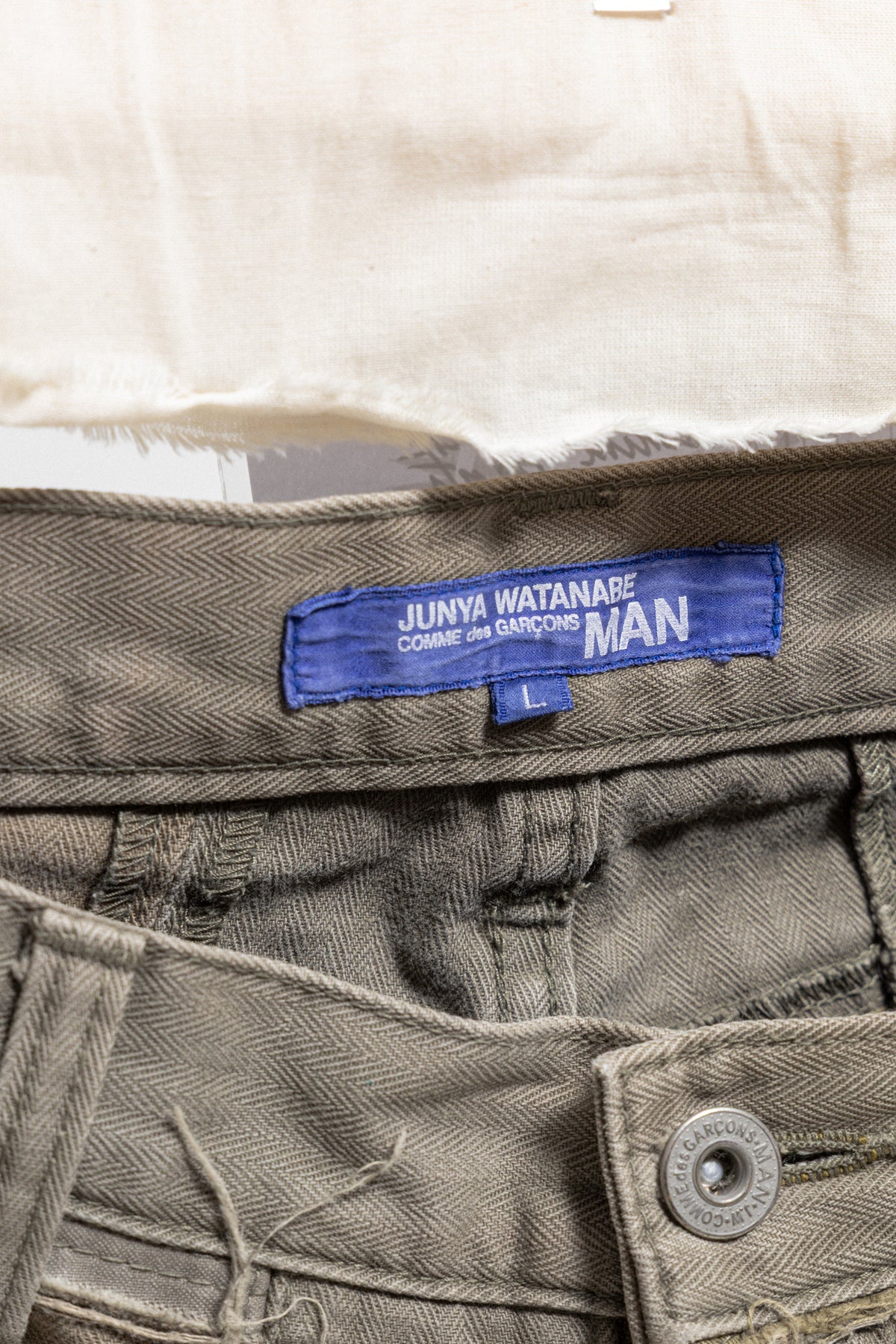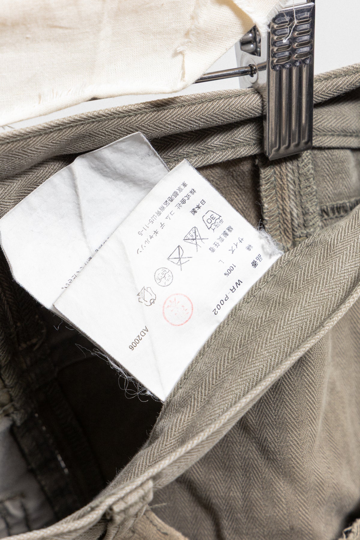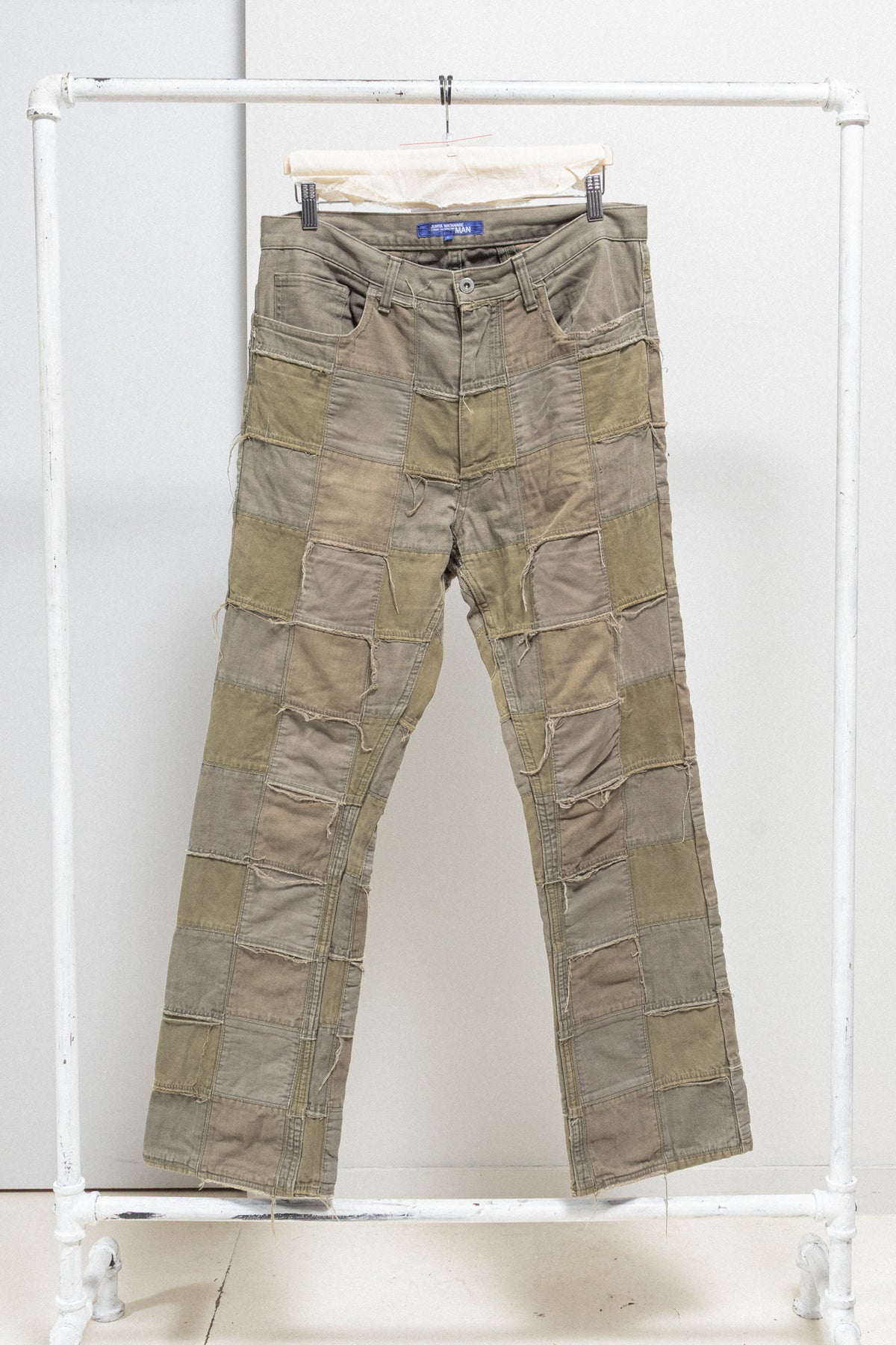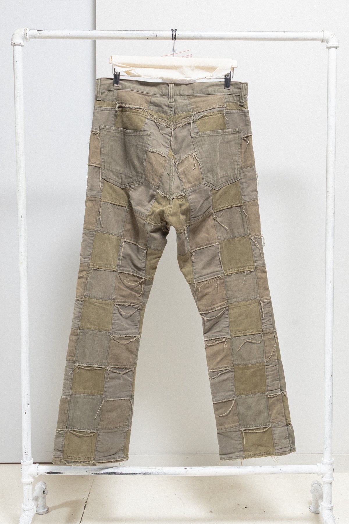 Beautiful khaki green cotton denim pants, featuring a heavily detailed work of patchwork that constructs the entirety of the garment legs with some of the patches sewn using a chevron pattern fabric. Frayed seams detail. Front closure with a metal zipper and a single button. Belt loops. Front pockets and back patch pockets.
