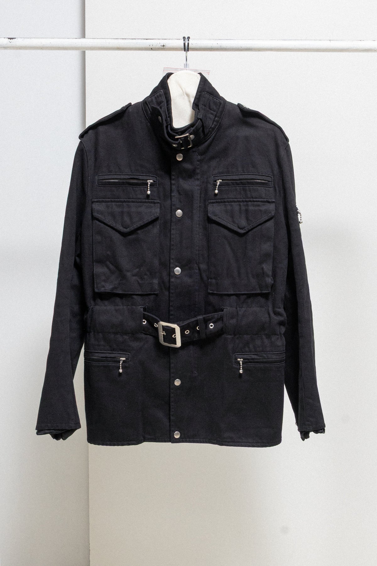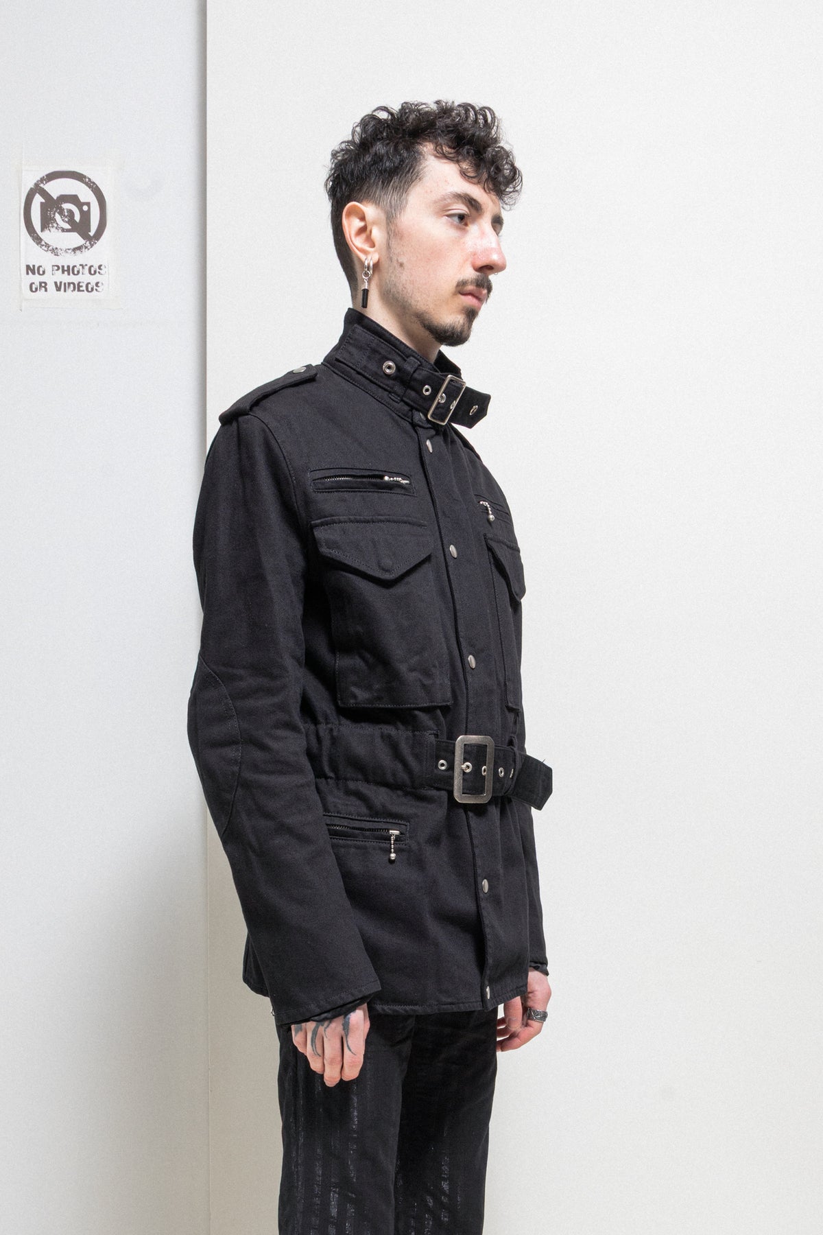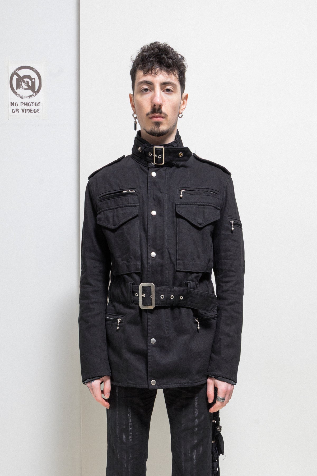 Incredibly detailed military style black jacket made of a textured cotton fabric, featuring numerous pockets of different types ranging from zip up to patch on the front of the garment as well as a high neck collar. Shoulder plackets. Front closure up to the neck with a metal zipper and eight snap buttons. Belts with metal buckles around the waist and around the collar. Cuff zip up slits. Black lining.