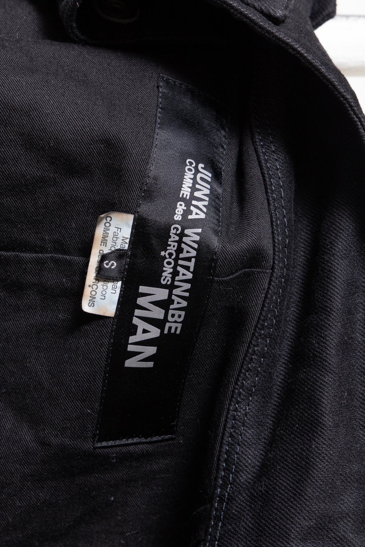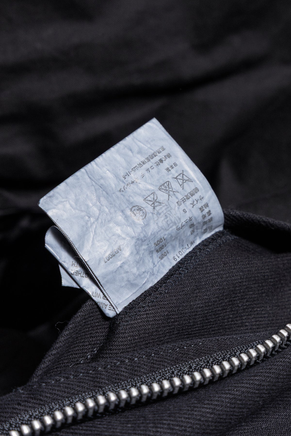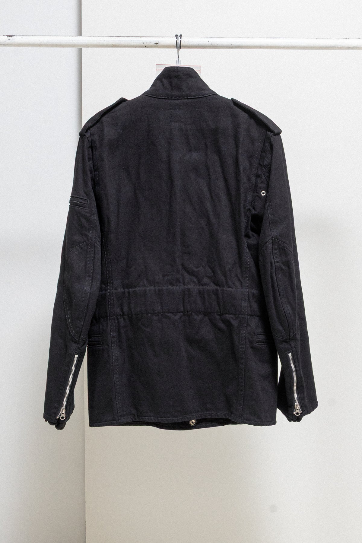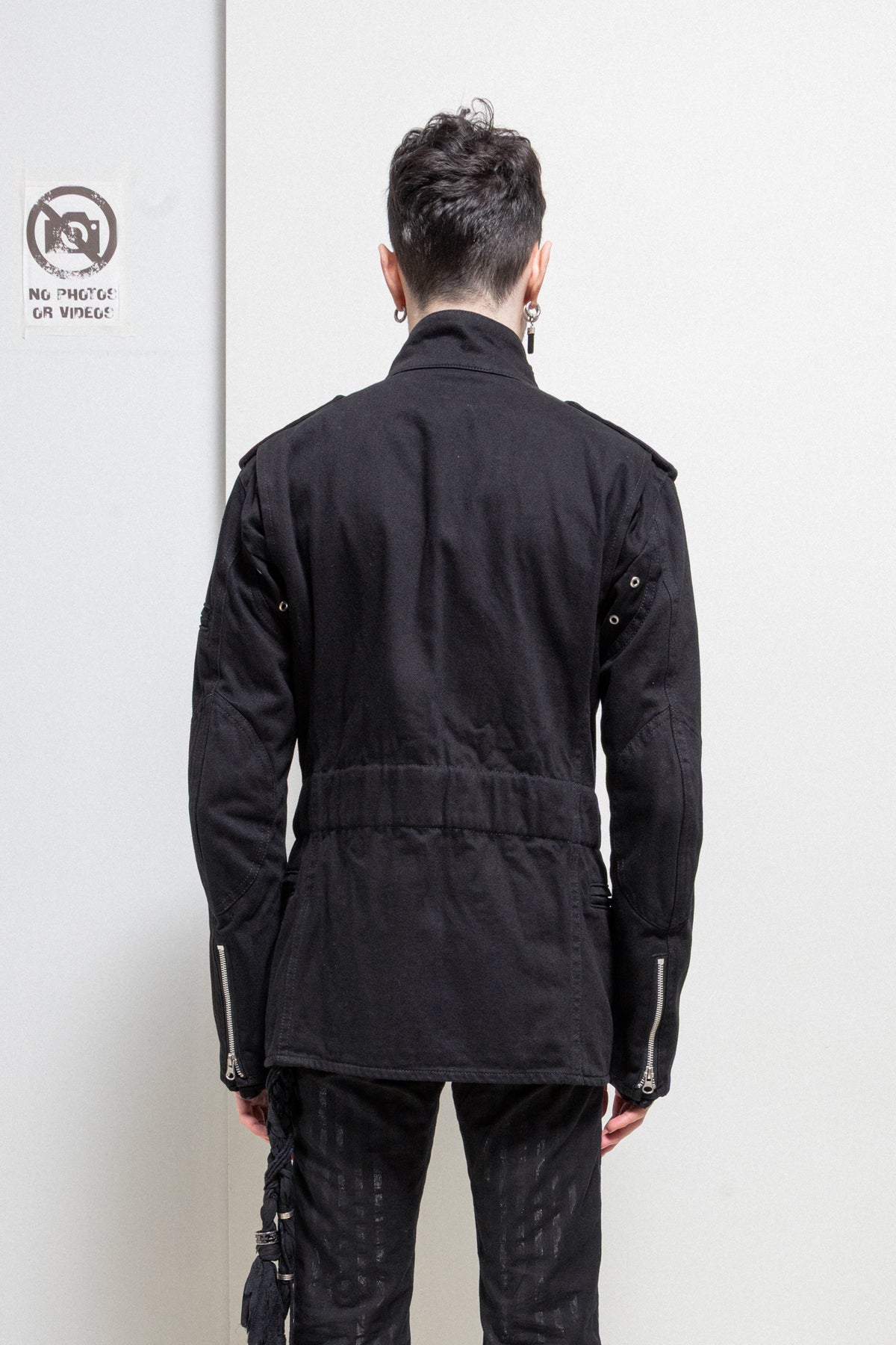Incredibly detailed military style black jacket made of a textured cotton fabric, featuring numerous pockets of different types ranging from zip up to patch on the front of the garment as well as a high neck collar. Shoulder plackets. Front closure up to the neck with a metal zipper and eight snap buttons. Belts with metal buckles around the waist and around the collar. Cuff zip up slits. Black lining.