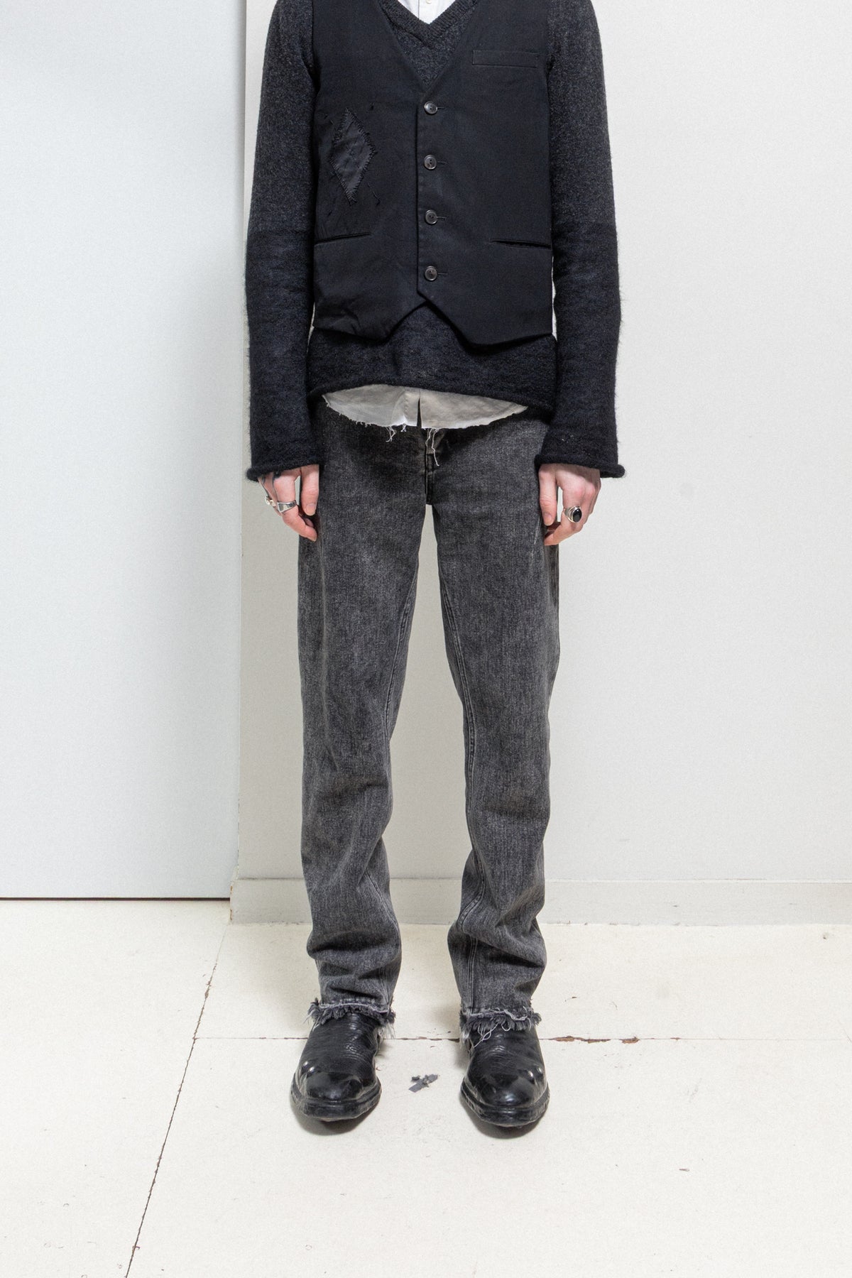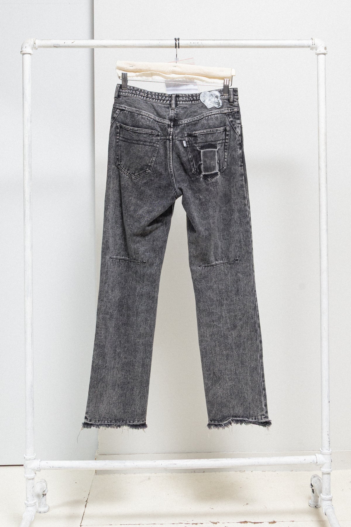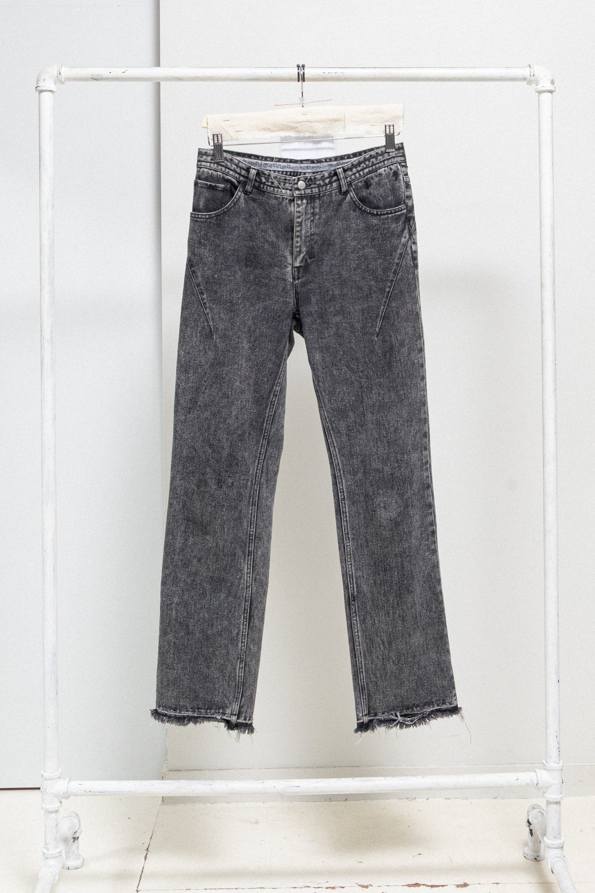 Nice grey washed pair of denim pants, featuring musical partition strap detail inside the waist belt and frayed edges at the bottom of the legs. Front and back middle leg darts. Front closure with a metal zipper and button. Belt loops. Front pockets and back flat pockets. Heart shape leather patch detail on the back.