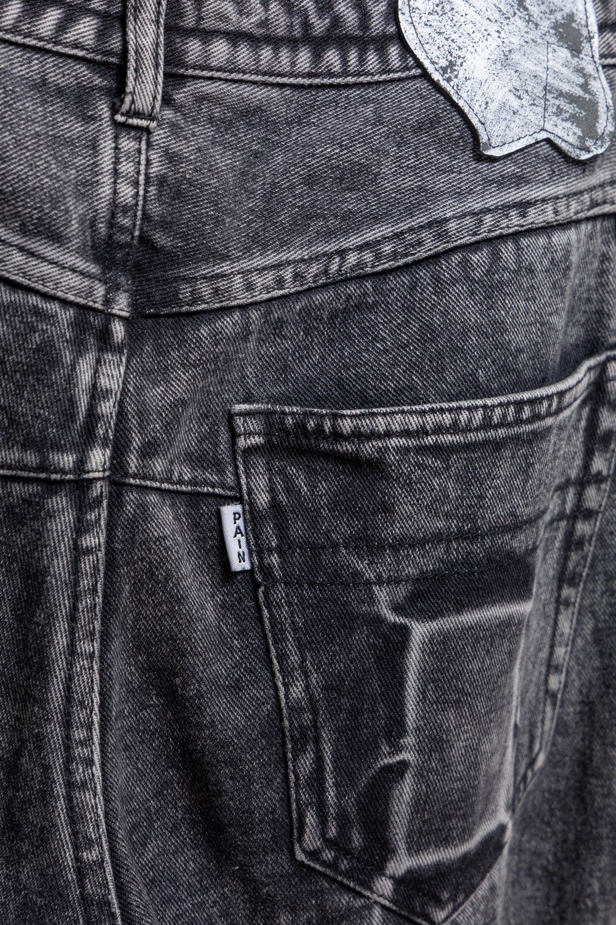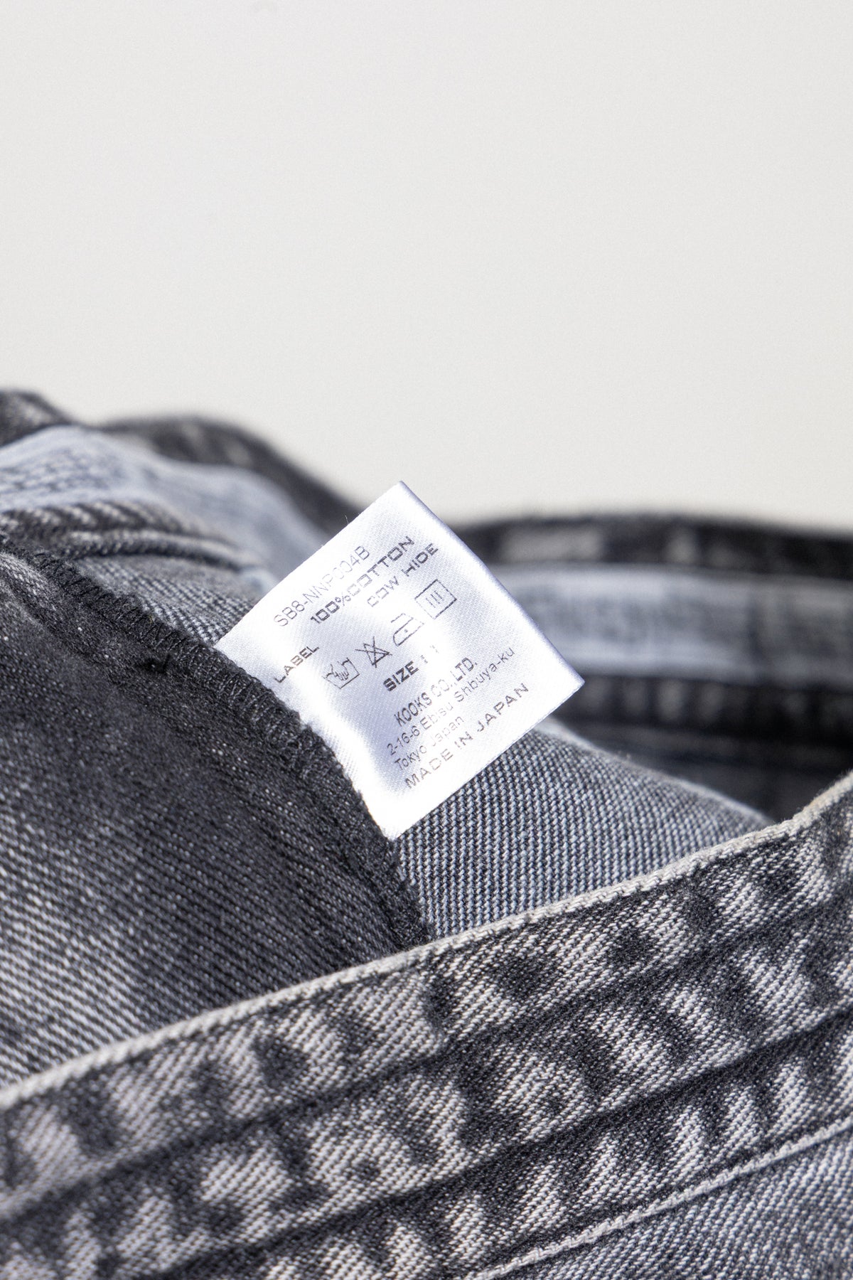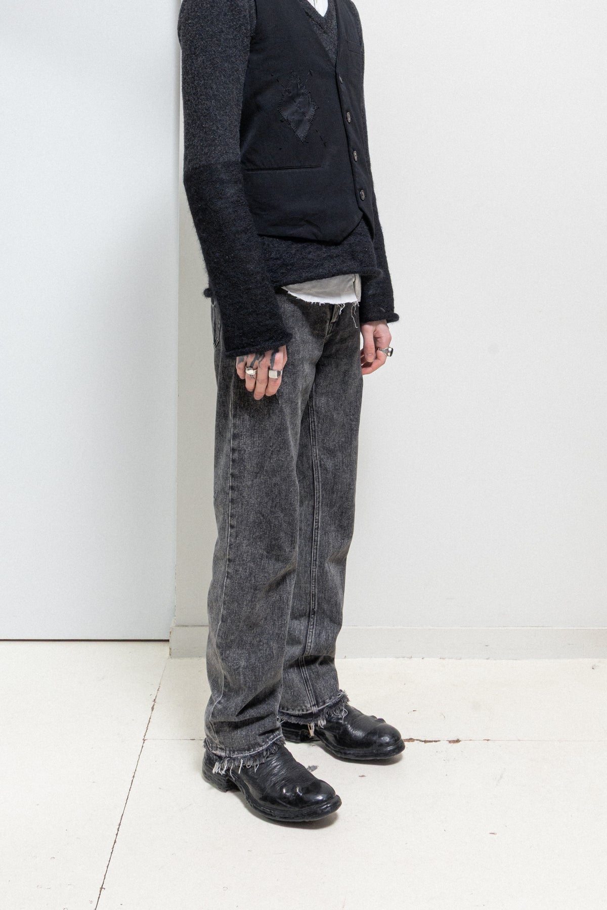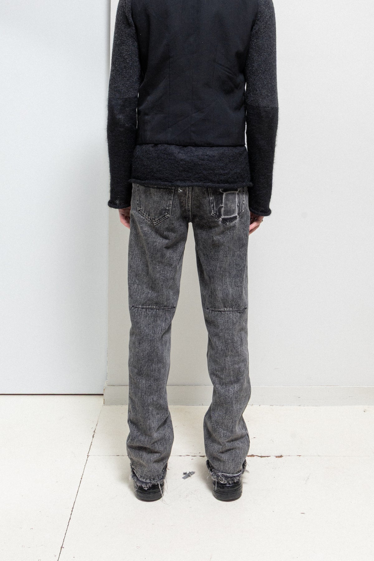Nice grey washed pair of denim pants, featuring musical partition strap detail inside the waist belt and frayed edges at the bottom of the legs. Front and back middle leg darts. Front closure with a metal zipper and button. Belt loops. Front pockets and back flat pockets. Heart shape leather patch detail on the back.