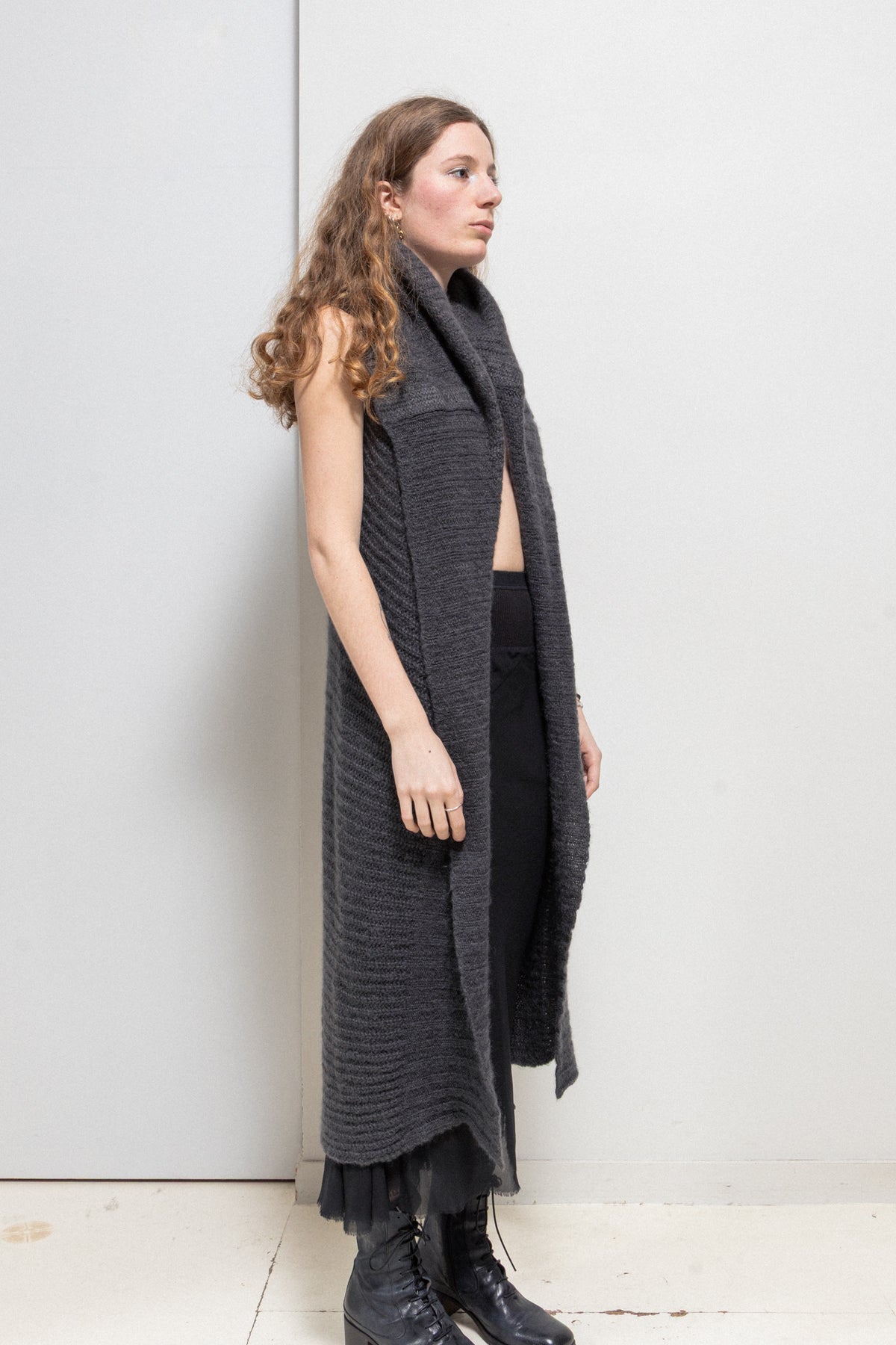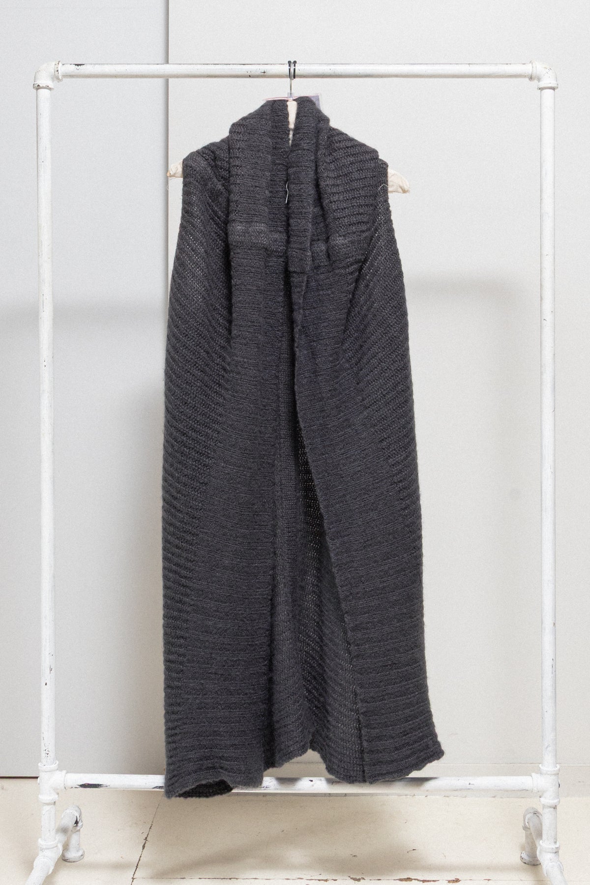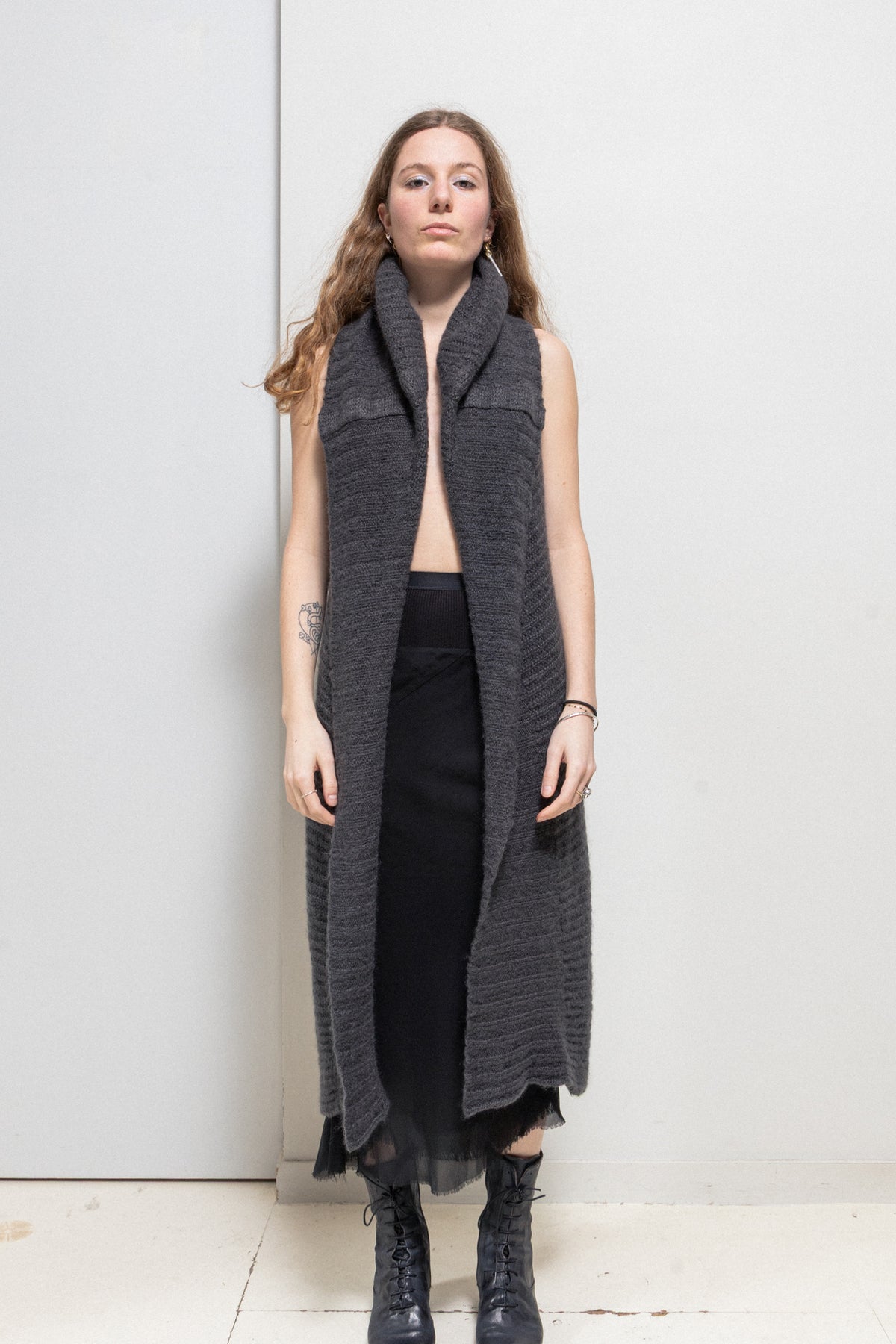 Beautiful cardigan made of a very soft and warm wool, featuring a thick ribbed texture and wide lapels that can be folded. Sleeveless and elongated silhouette.