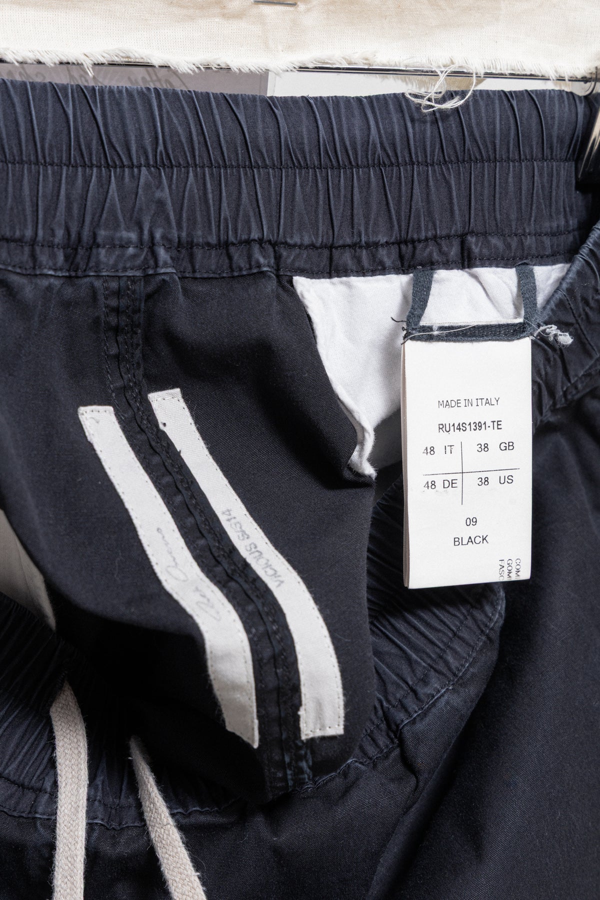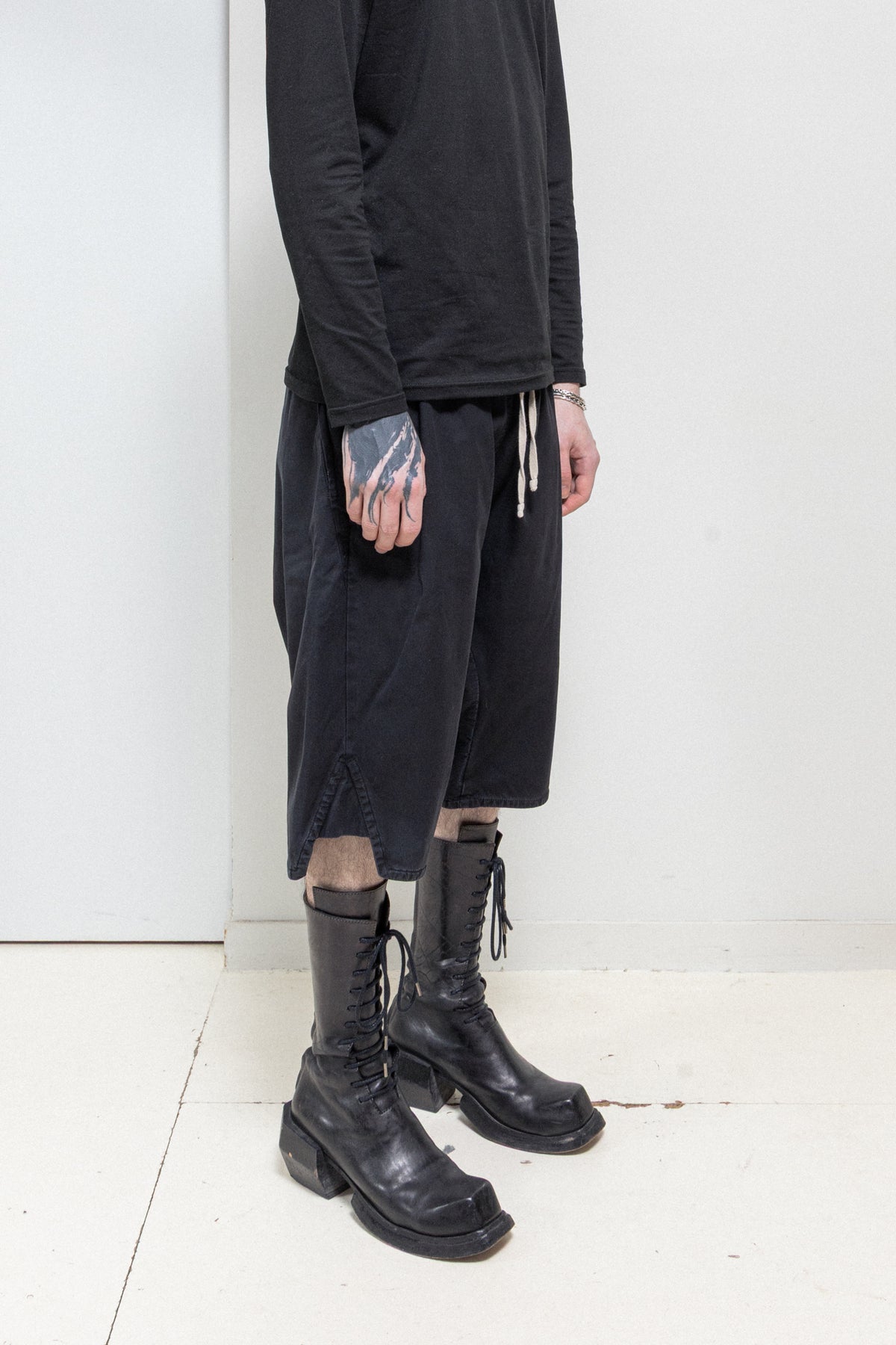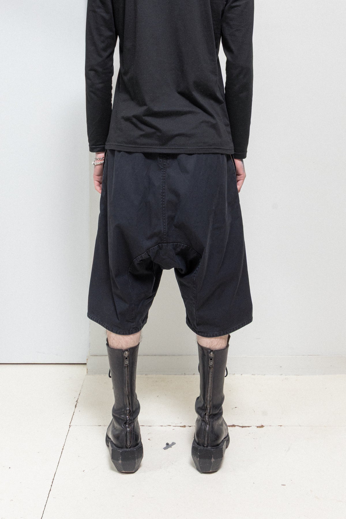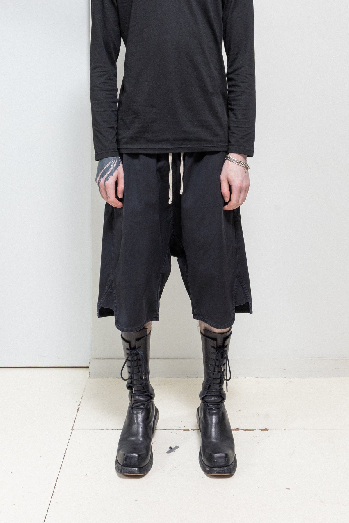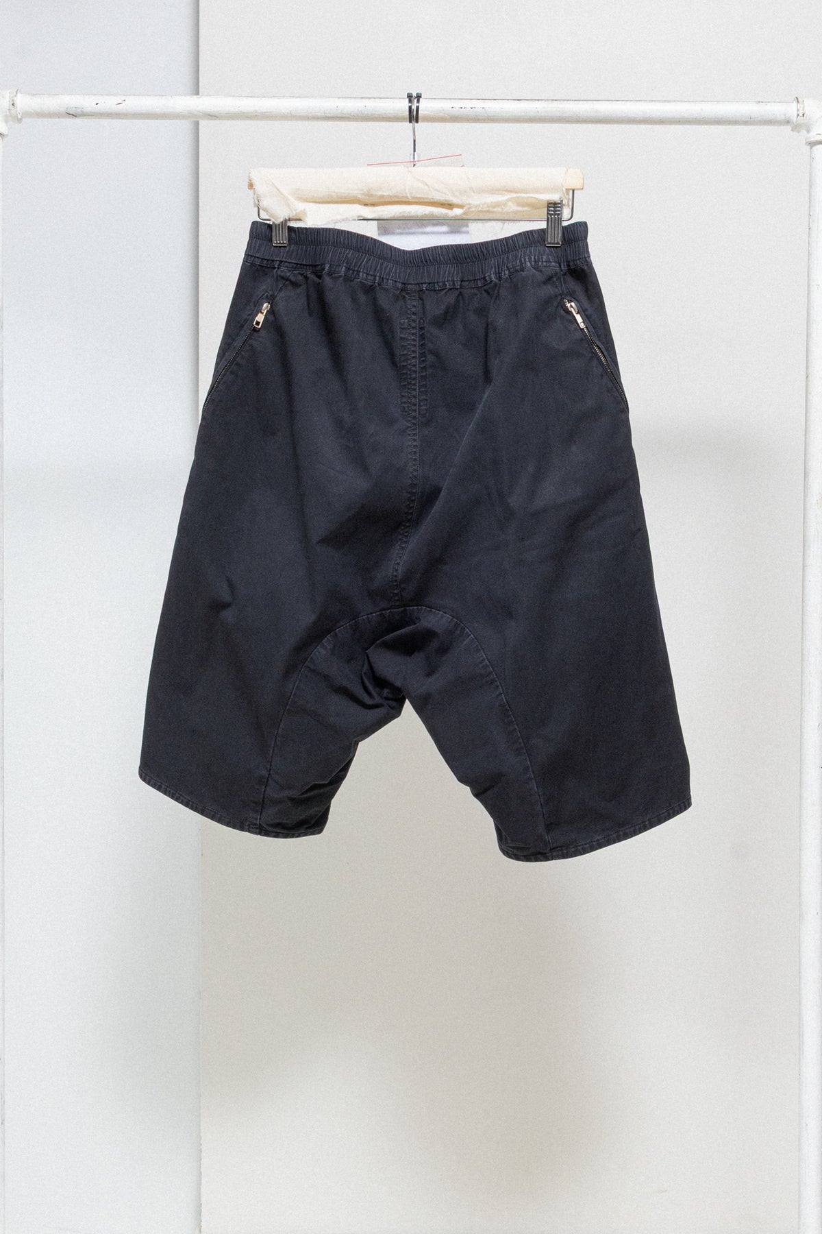 Amazing pair of shorts made of cotton, featuring metal zipper pockets on each side and splits at the bottom of the legs partially filled with a triangle panel of fabric. Elastic waist with contrasting cream-colored drawstrings. Front seam pockets. Drop crouch with a panel separating the front from the back between the legs.