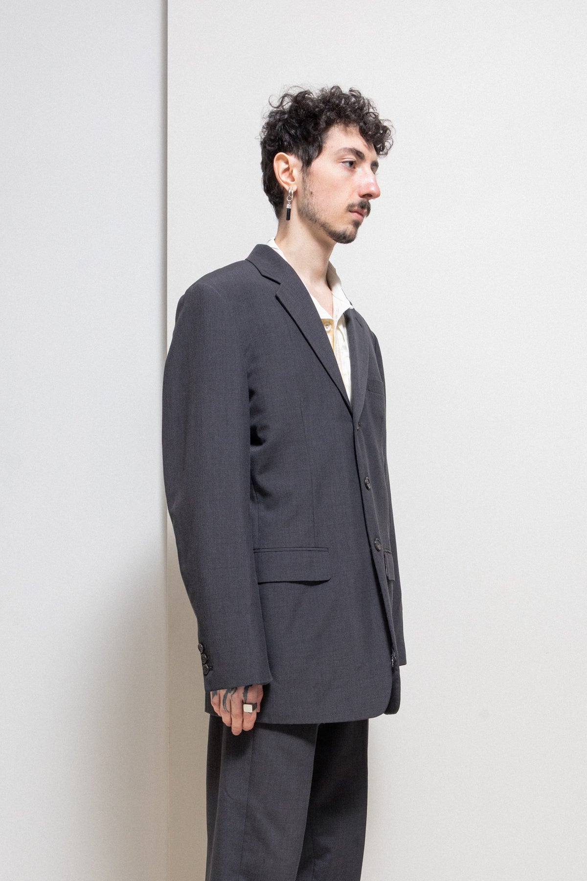 Beautiful costume jacket made of a fine wool, featuring contrasting cross pattern lining. Oversized cut with three button closure, padded shoulders, notch lapels, structuring darts, a back slit, cuff buttoning, a flap pocket each side and a chest pocket.