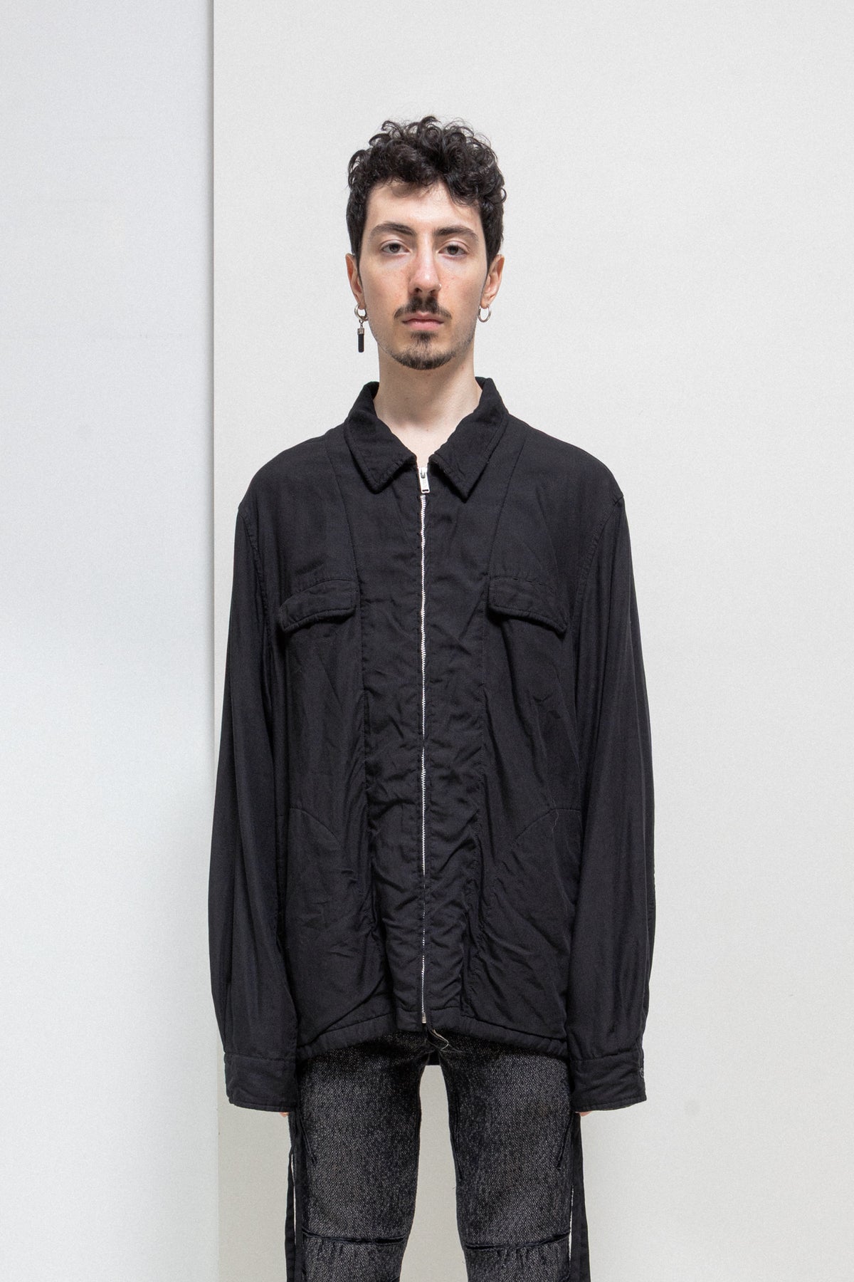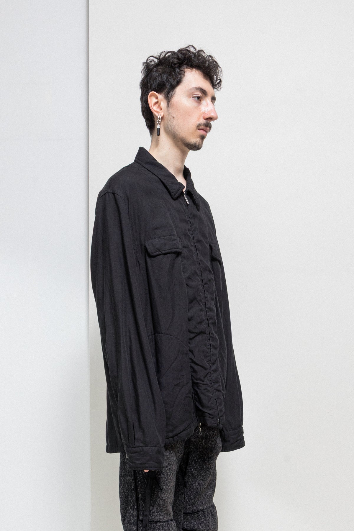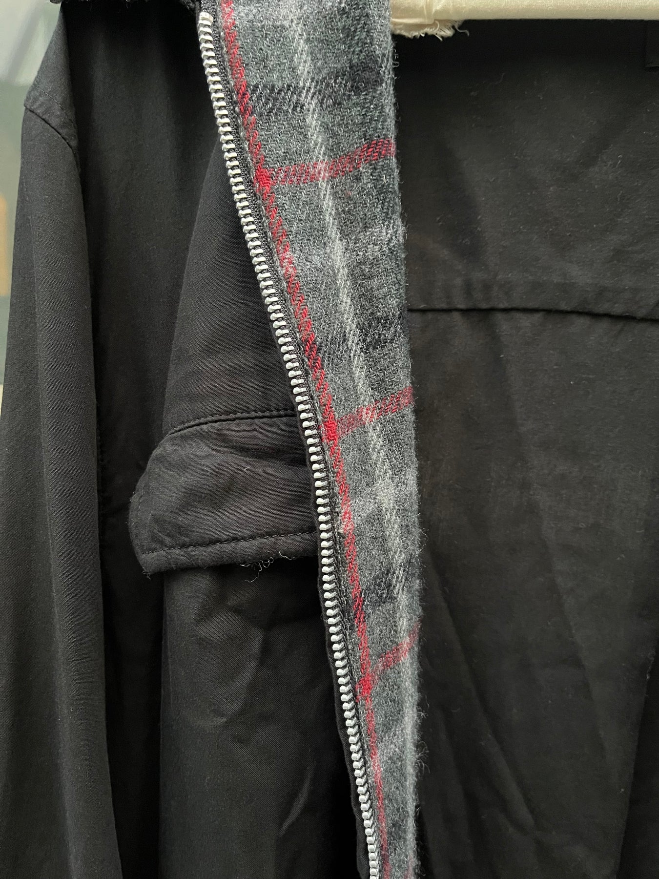 Incredible black lightweight jacket made of a soft rayon fabric, featuring details of plaid wool that can be found inside the pockets, under the collar and as the facing on the inside. Shirt collar. Ruched front closure with a metal zipper. Front piped and flap pockets. Side slits with two buttons and some strings at the bottom. Middle back pleats. Cuff splits with two buttons. No lining and shoulder pads.