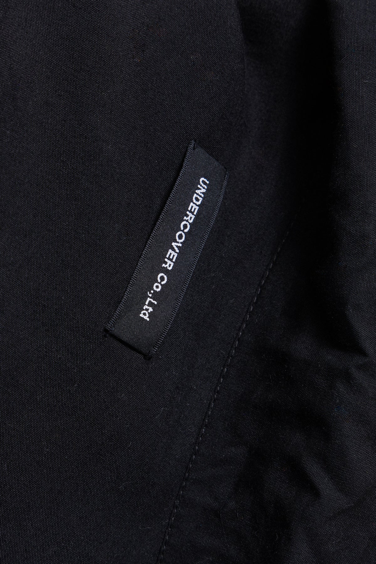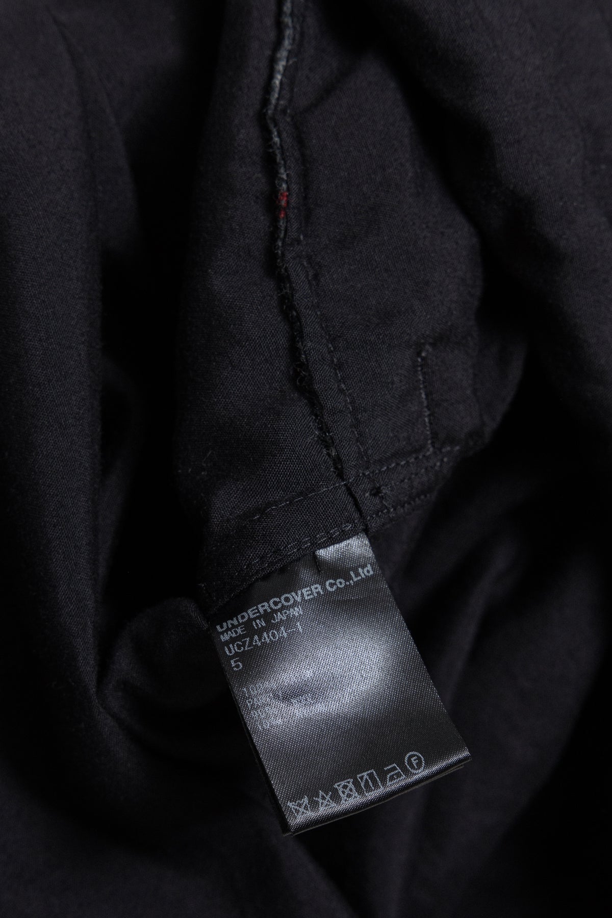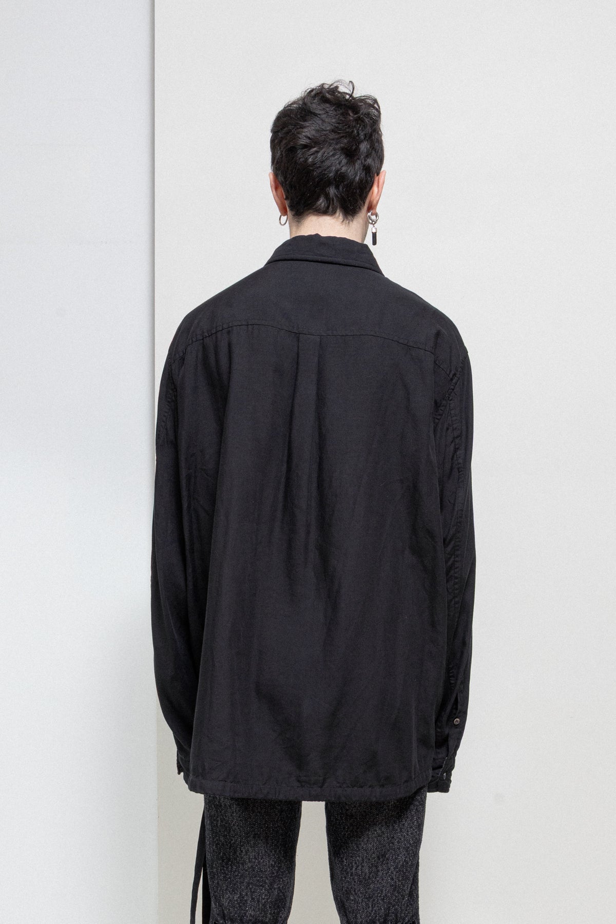 Incredible black lightweight jacket made of a soft rayon fabric, featuring details of plaid wool that can be found inside the pockets, under the collar and as the facing on the inside. Shirt collar. Ruched front closure with a metal zipper. Front piped and flap pockets. Side slits with two buttons and some strings at the bottom. Middle back pleats. Cuff splits with two buttons. No lining and shoulder pads.