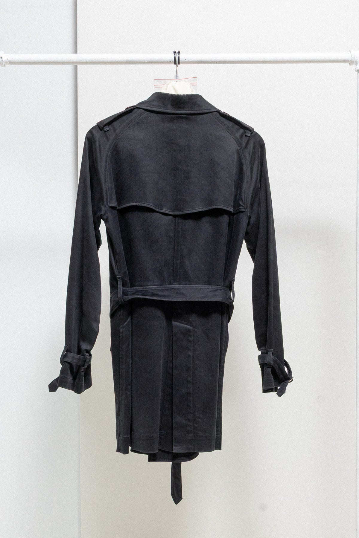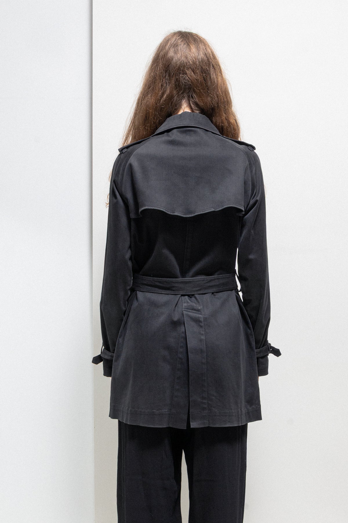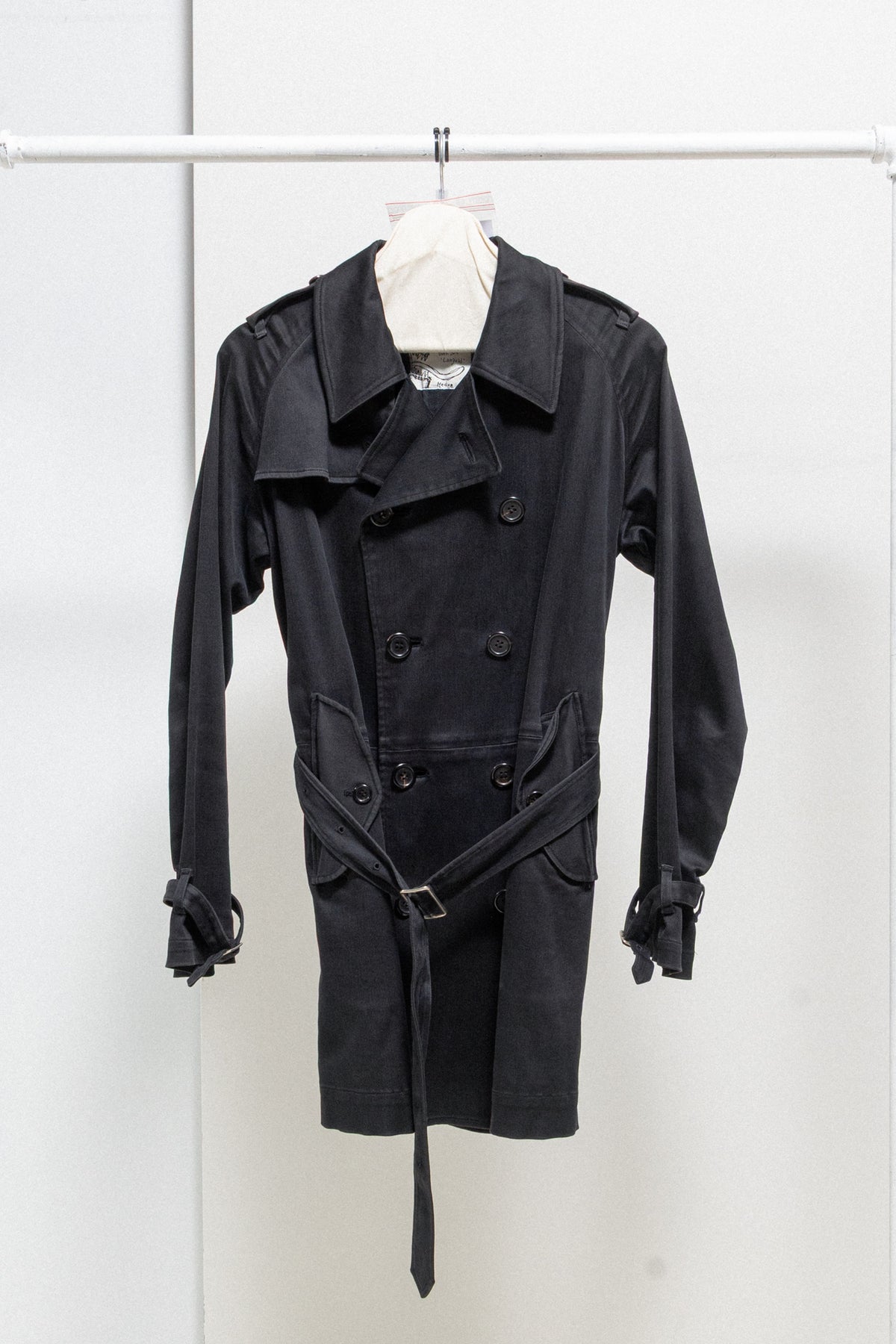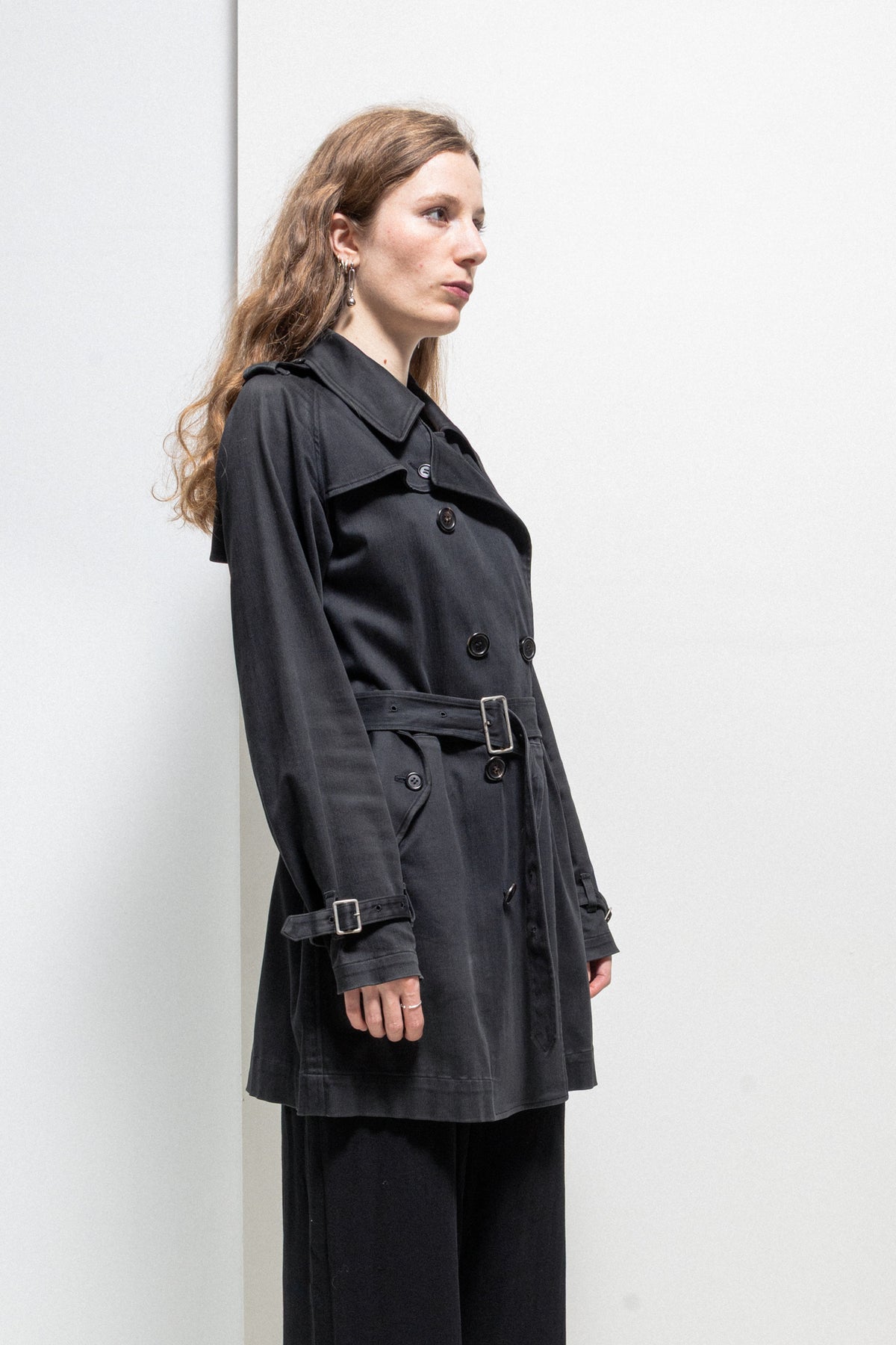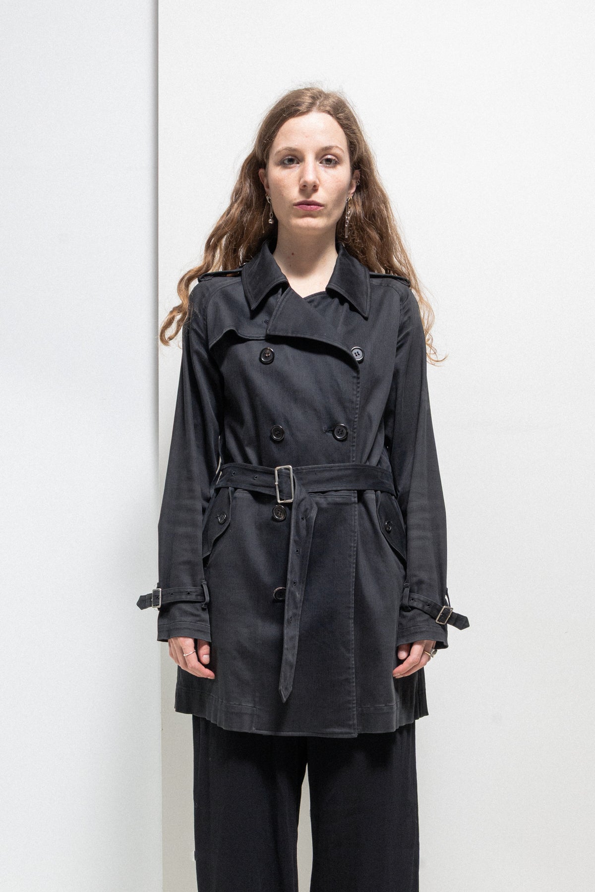 Incredible black faded trench coat made of a light and soft cotton fabric, featuring a double-breasted front closure with eight buttons as well as a chest flap that can be also attached using a button. Front raglan pockets with button up flaps. Raglan sleeves with buckled cuff straps at their end. Shoulder plackets with loops. Upper back layered flap panel. Waist belt with loops and metal buckle. Middle back slit. No lining.