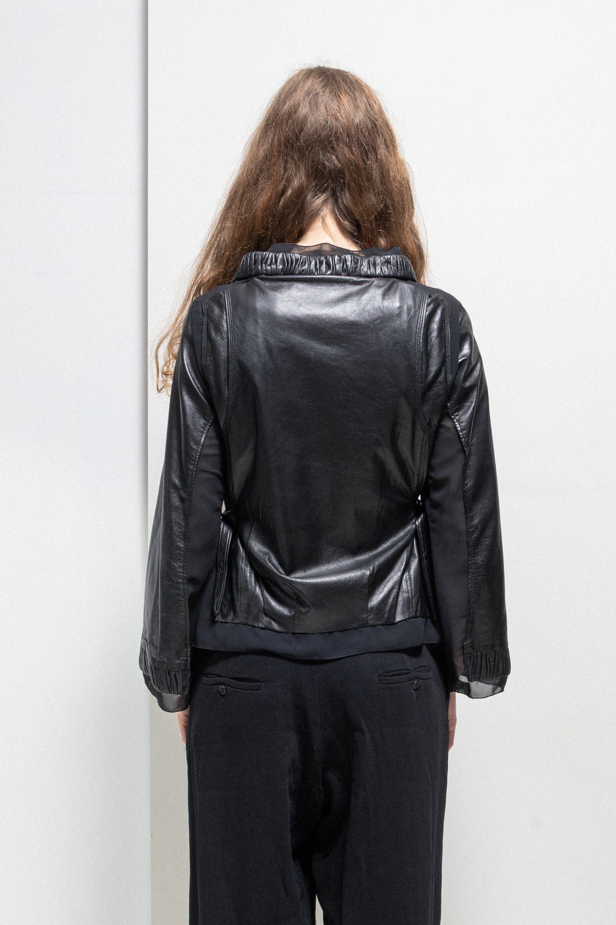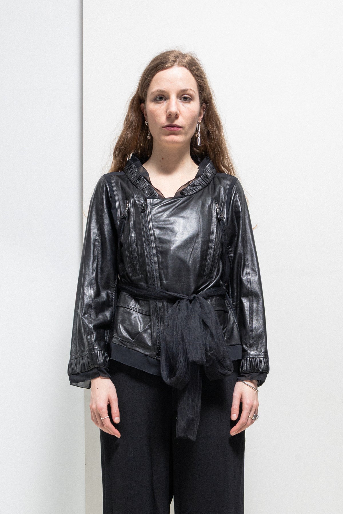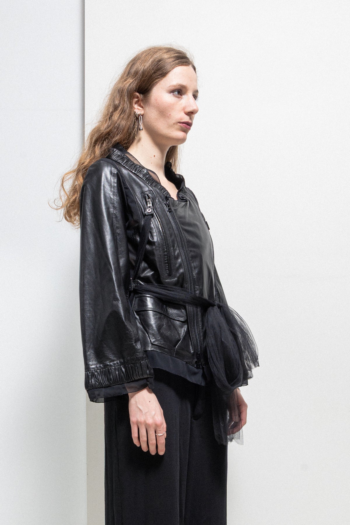 Amazing detailed black cropped jacket made of a light and see-through tulle fabric, featuring numerous clashing panels of lambskin layered on top of the garment's main material as well as tulle straps that can be tied around the body and are originally attached to the tips of the two zip up pockets placed on the chest. Pleated leather collar and ruffly tulle collar. Front crossed zipper closure. Front piped pockets with flaps. Side straps with metal buckles. Flared sleeves. Tulle lining.