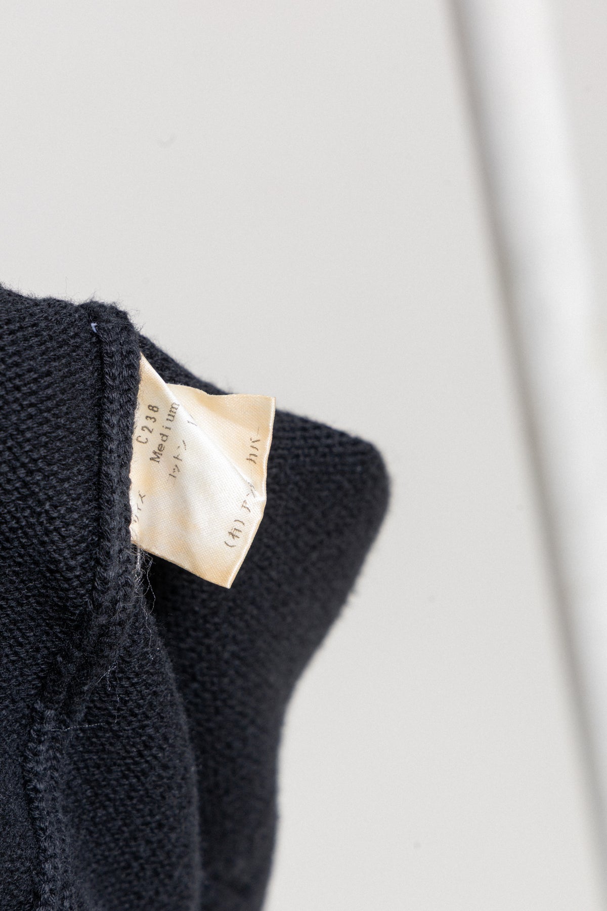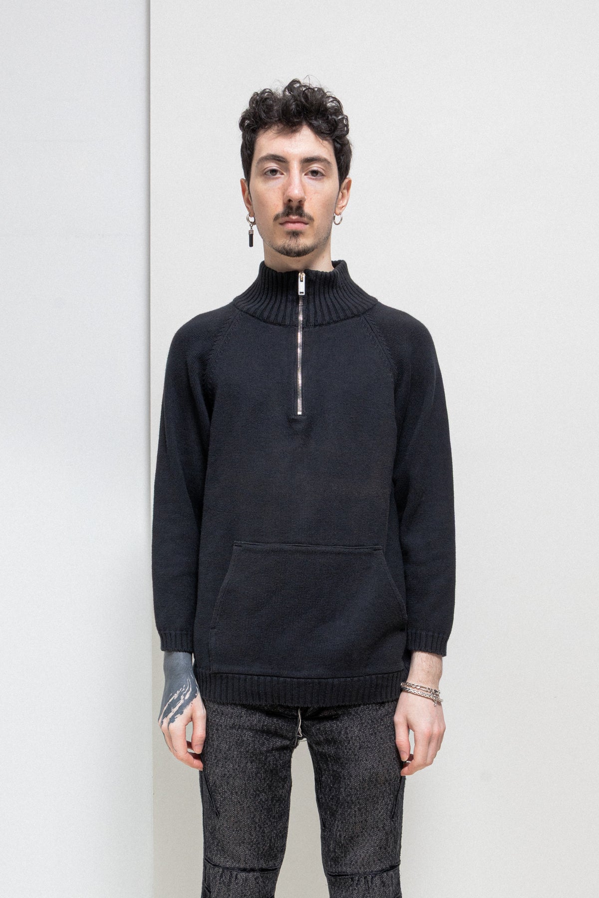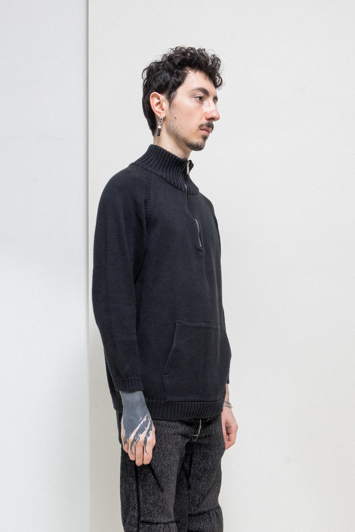 Amazing black sweater made of thick cotton knitted fabric, featuring a ribbed high neck collar that opening with a metal zipper in the middle. Raglan sleeves with ribbed cuffs. Front kangaroo pocket. Ribbed bottom edge.