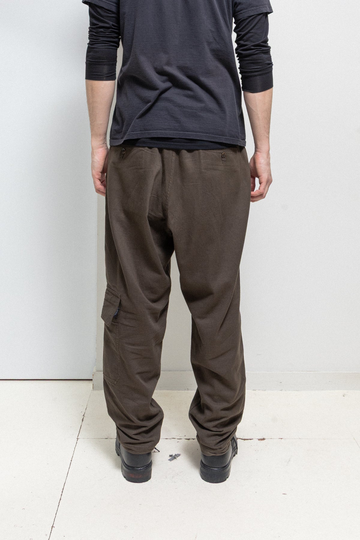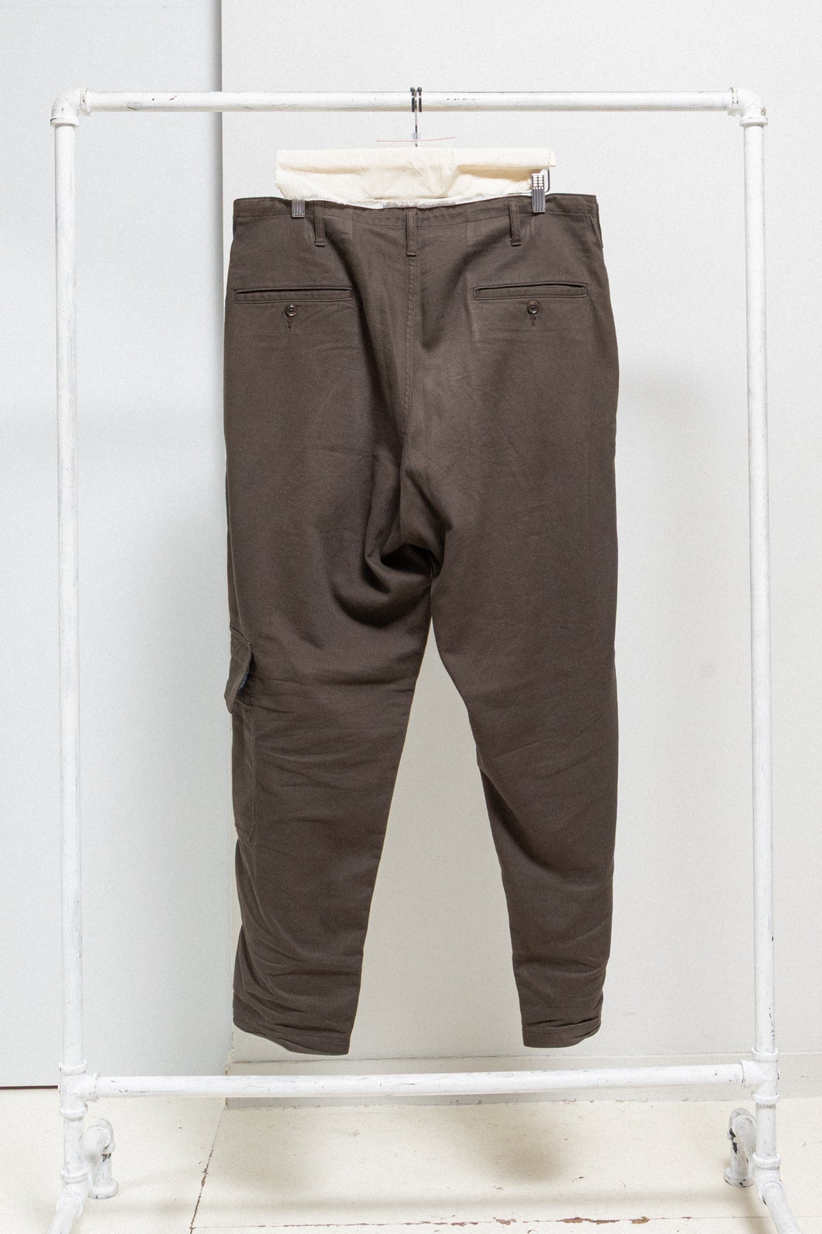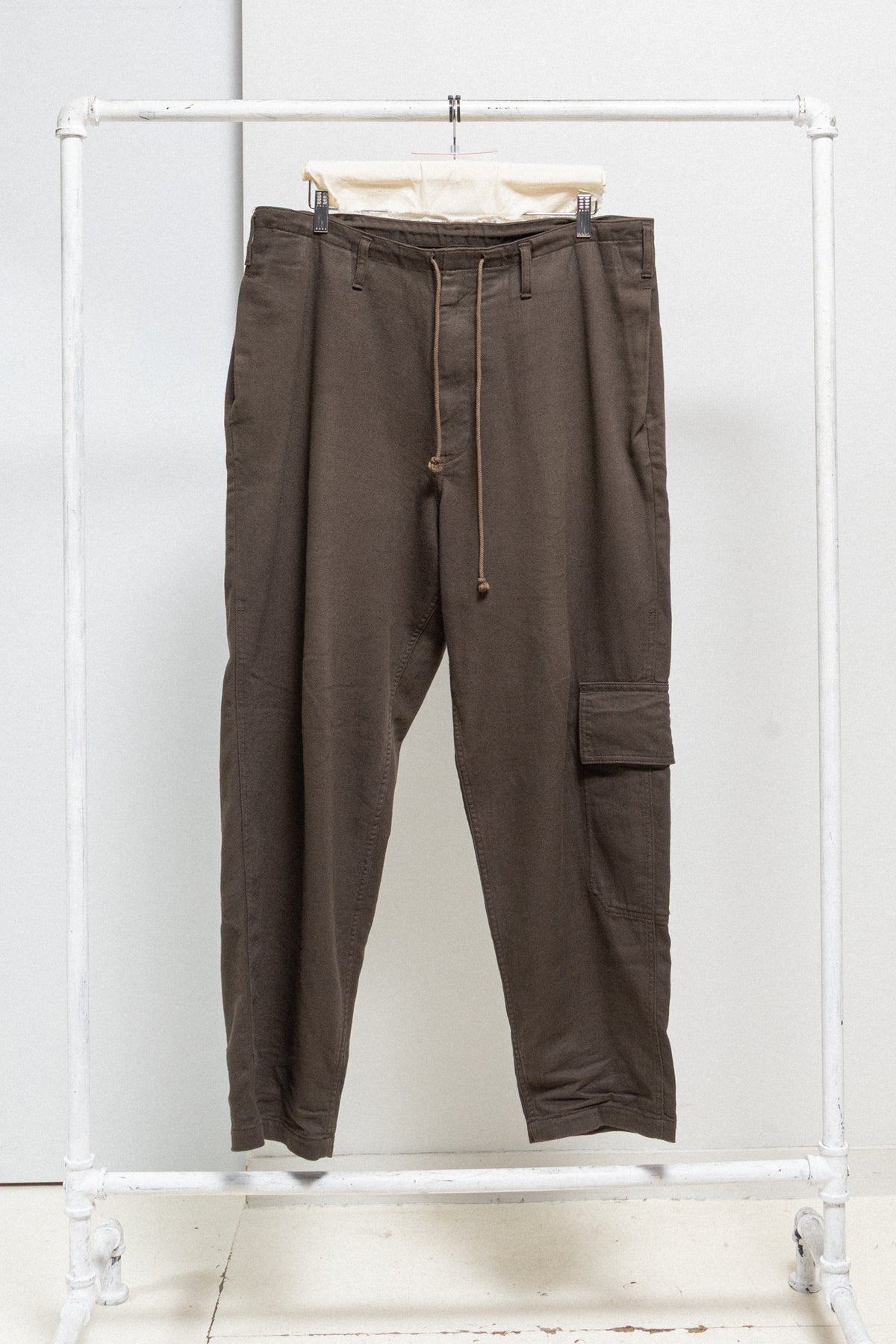 Amazing brown pair of pants made of thick cotton fabric, featuring a front fly with a metal zipper and a lace to tighten up the waist. Side seam pockets. Back pipped pockets with pockets. Single flap pocket on the left leg. Belt loops.