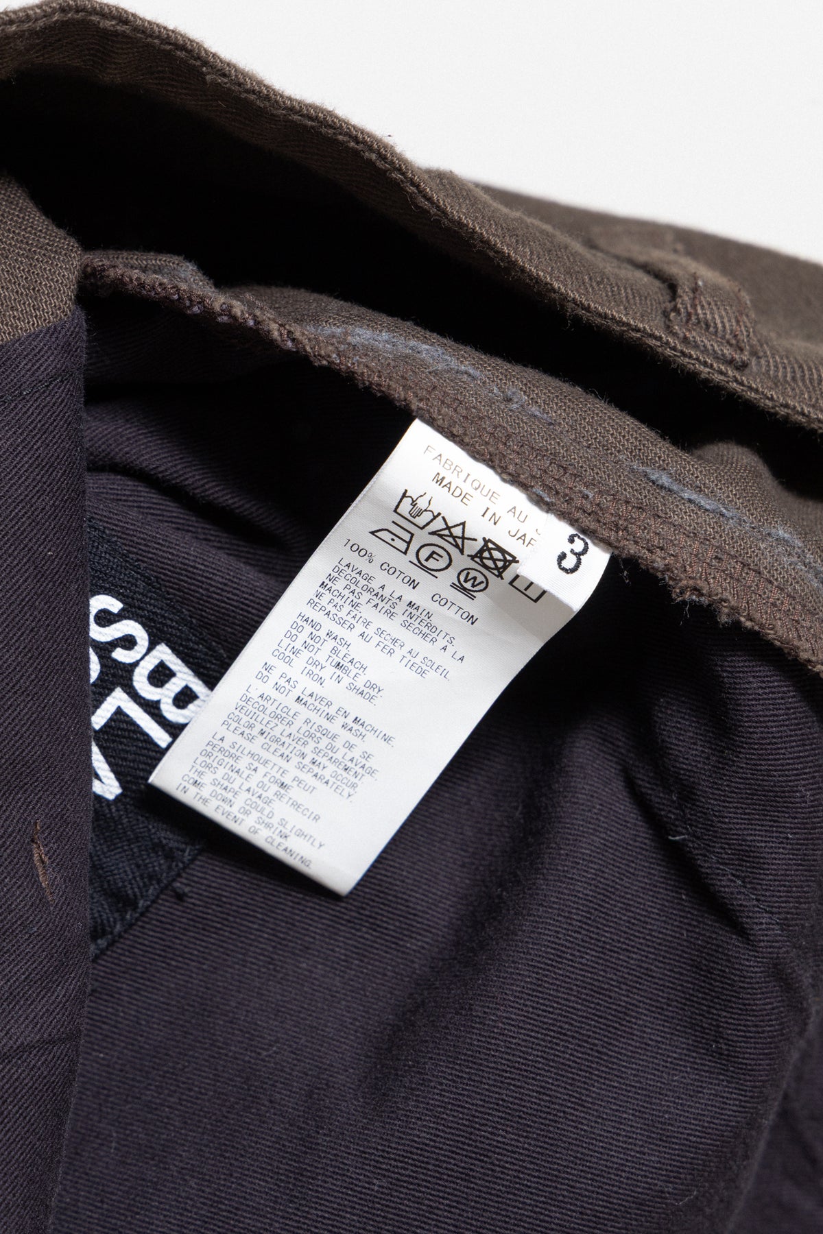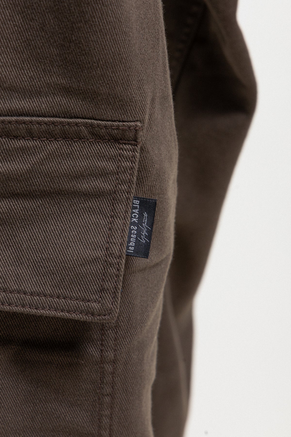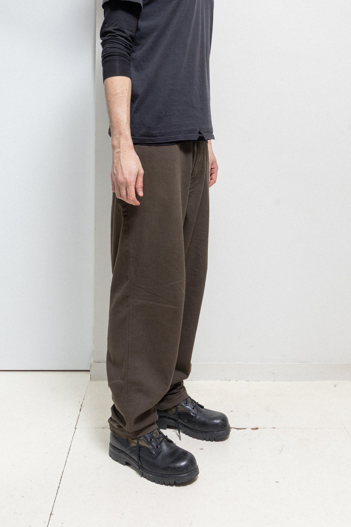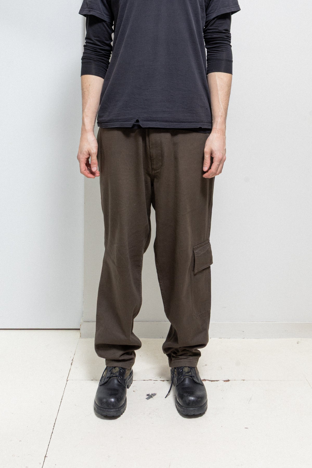 Amazing brown pair of pants made of thick cotton fabric, featuring a front fly with a metal zipper and a lace to tighten up the waist. Side seam pockets. Back pipped pockets with pockets. Single flap pocket on the left leg. Belt loops.