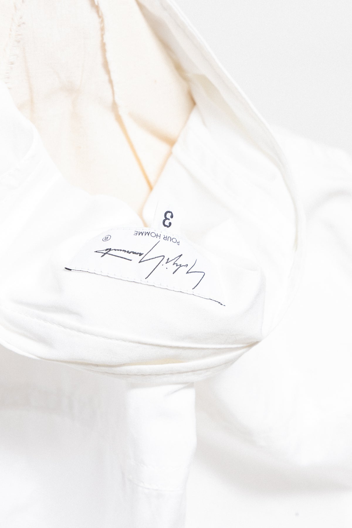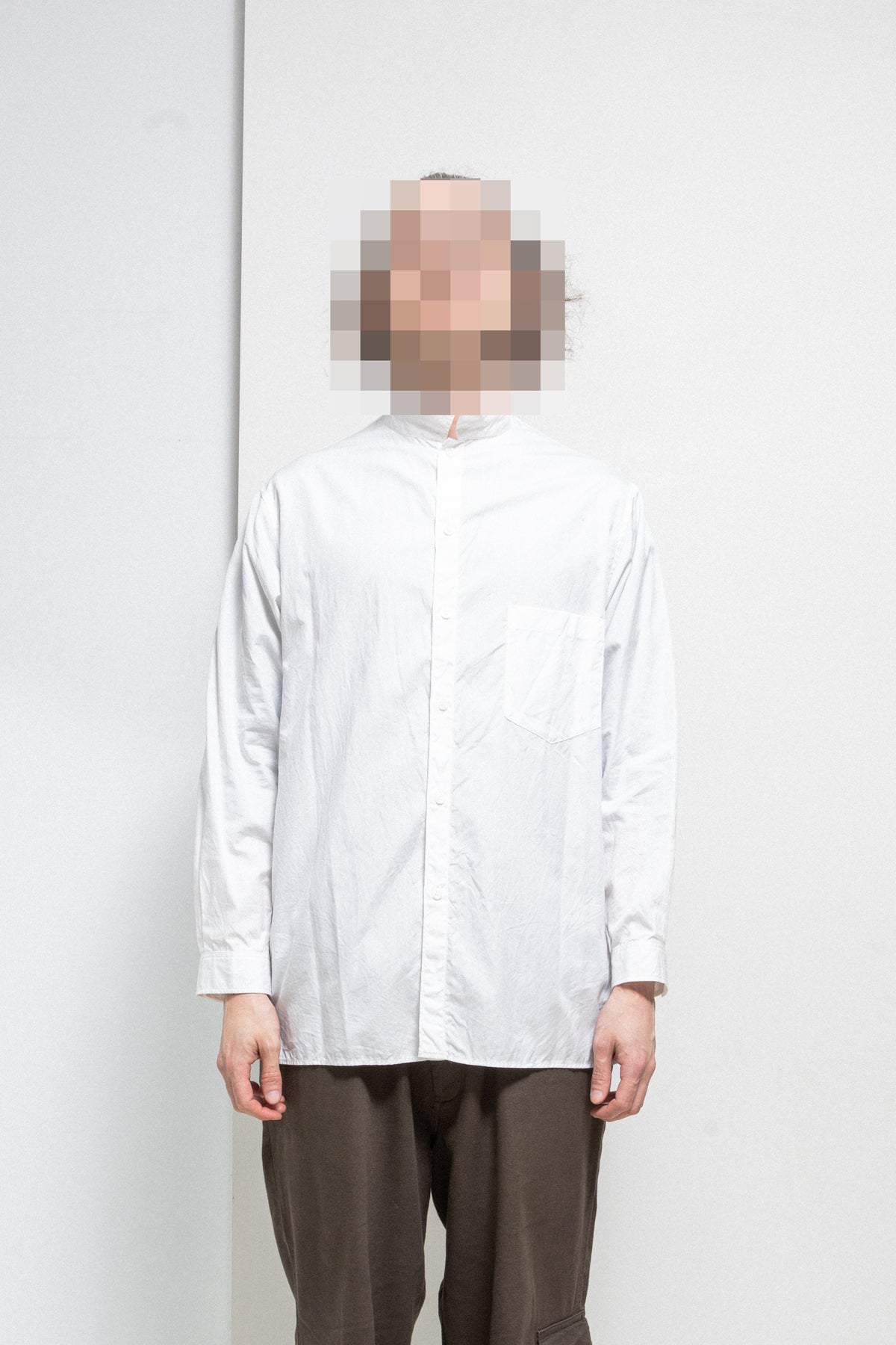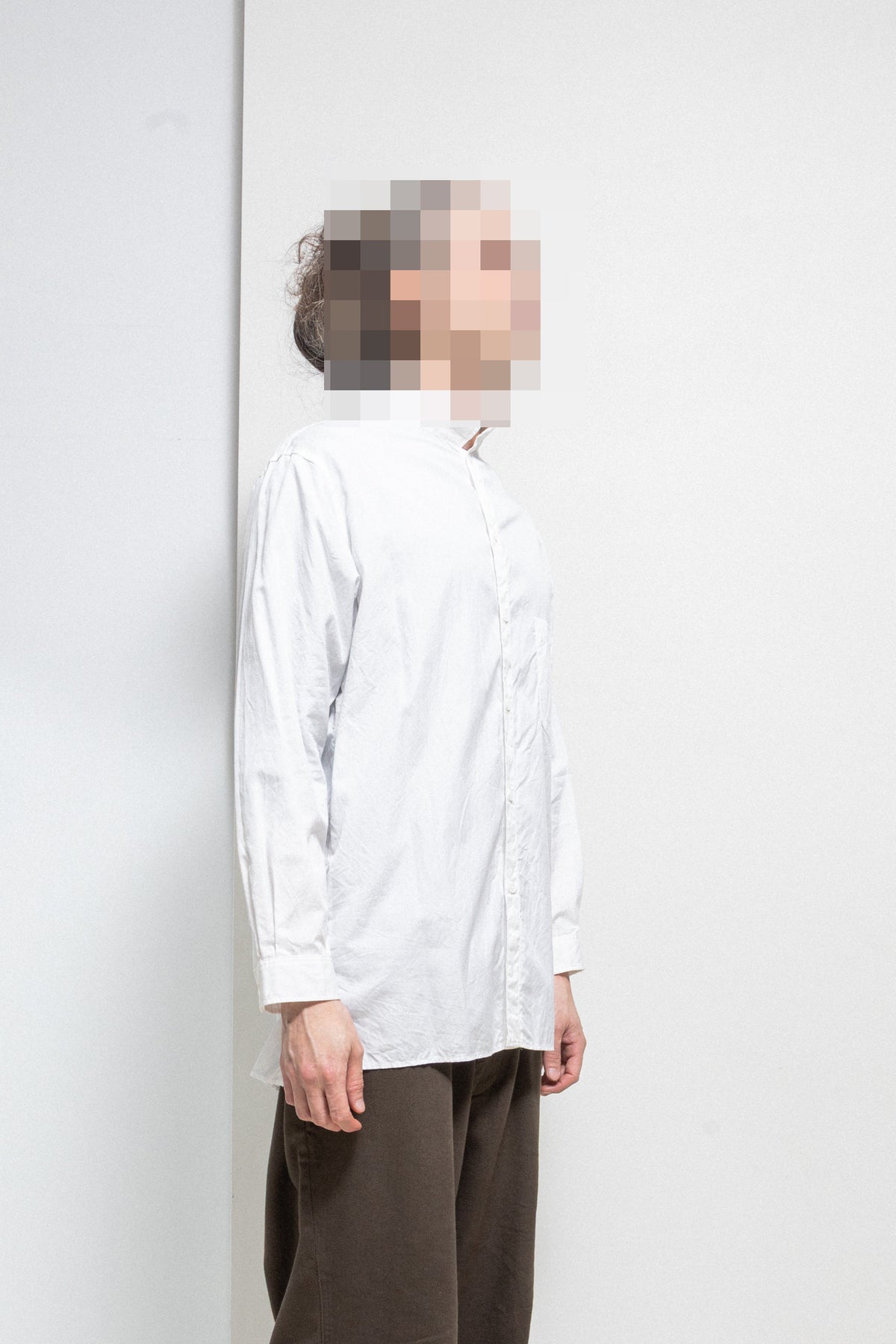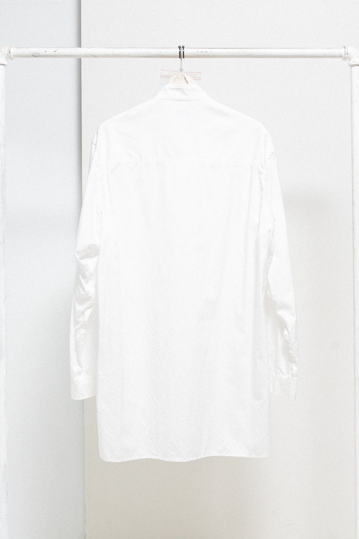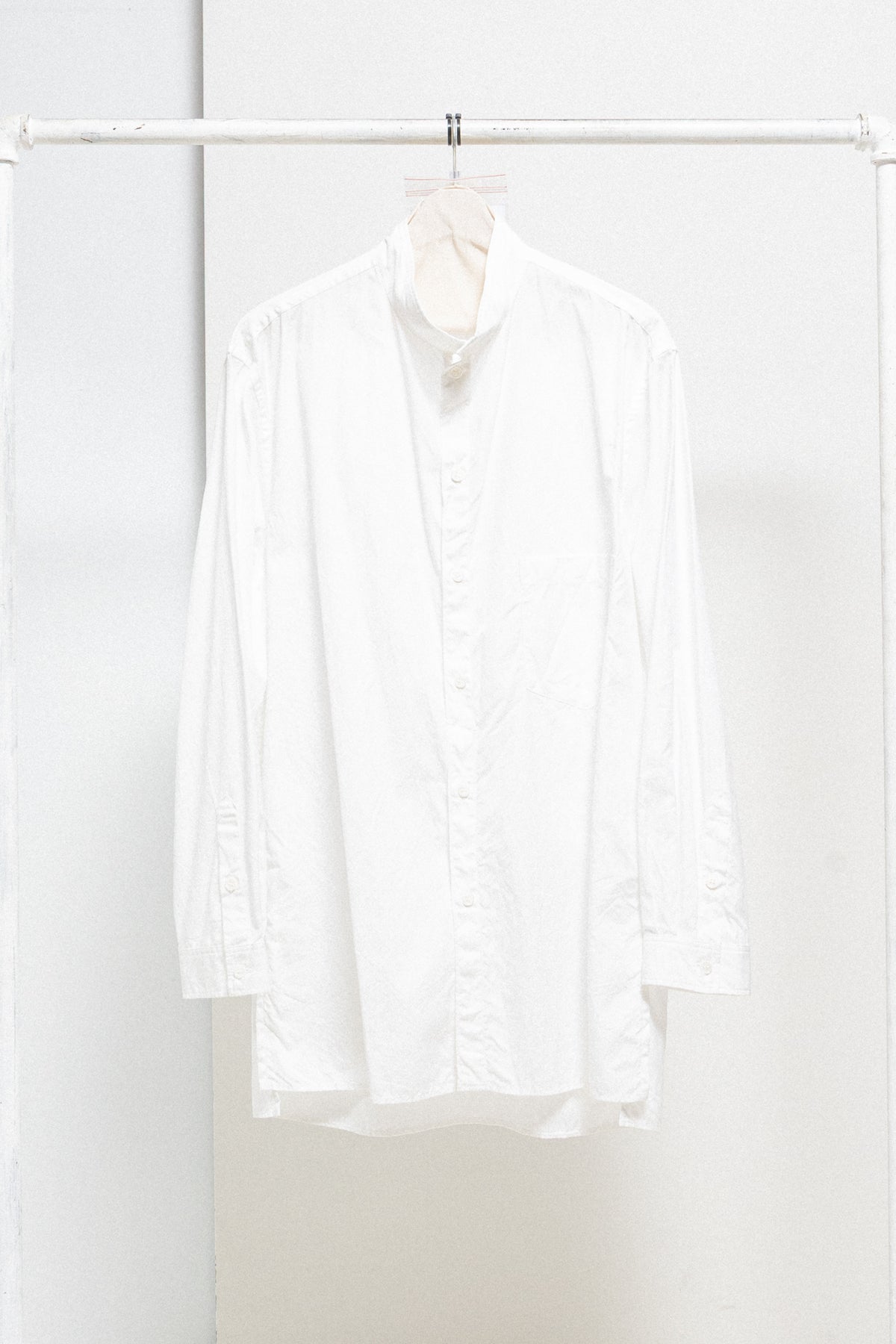 Fantastic white elongated shirt made of light cotton fabric, featuring a slightly longer back and a standing shirt collar. Front closure with six buttons. Chest flat pocket. Side slits. Cuff splits with pleats and two buttons.