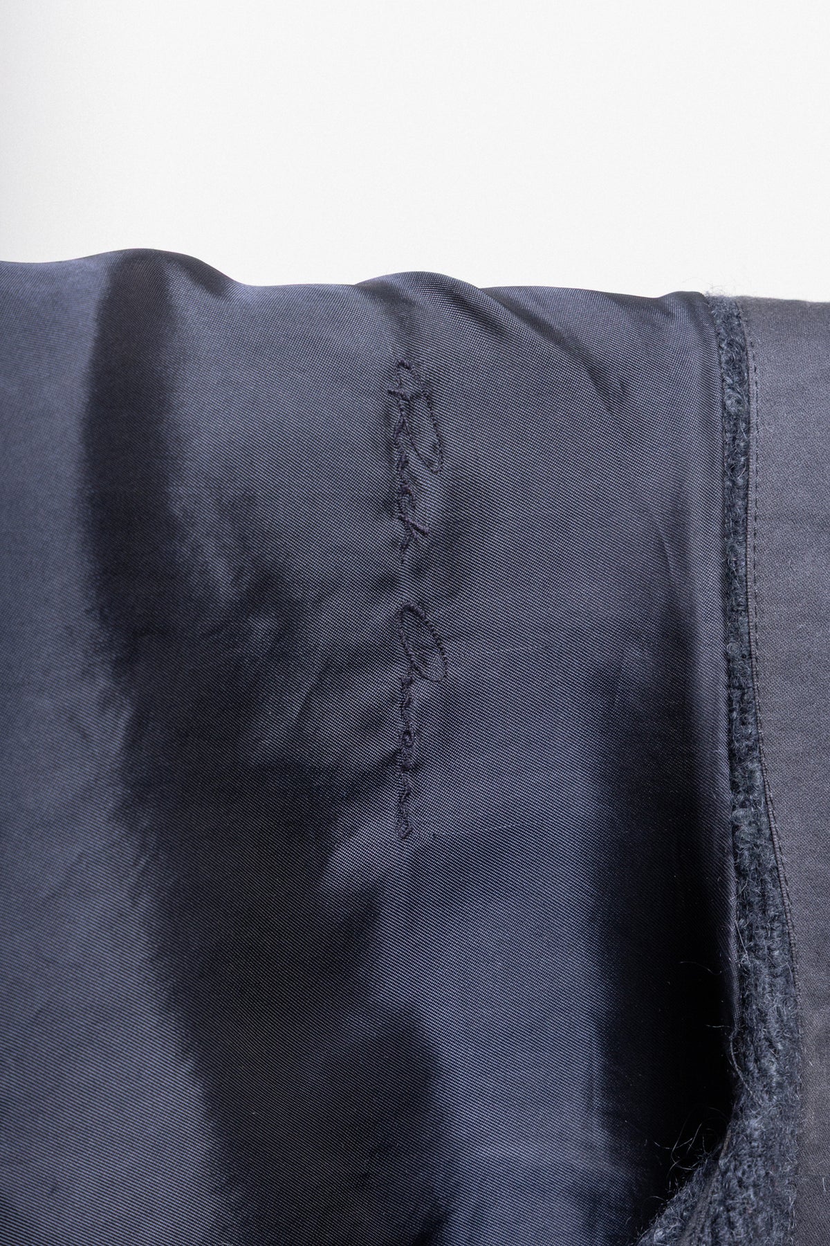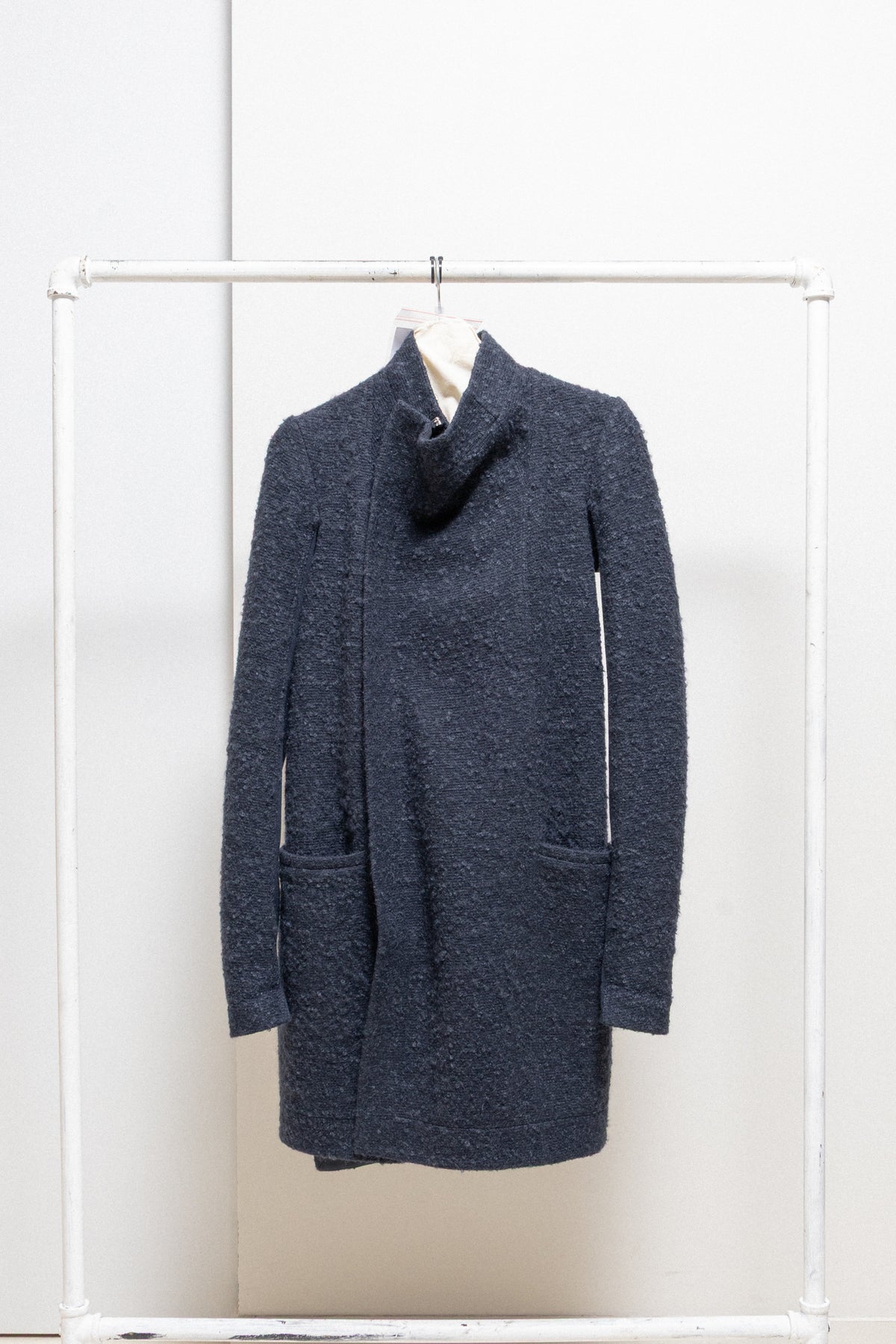 Beautiful coat made of a warm and textured mohair wool blend, featuring a hidden side zipper closure and a high neck. Sharp shoulders with elongated sleeves and signature ribbed underarms, large pockets each side.