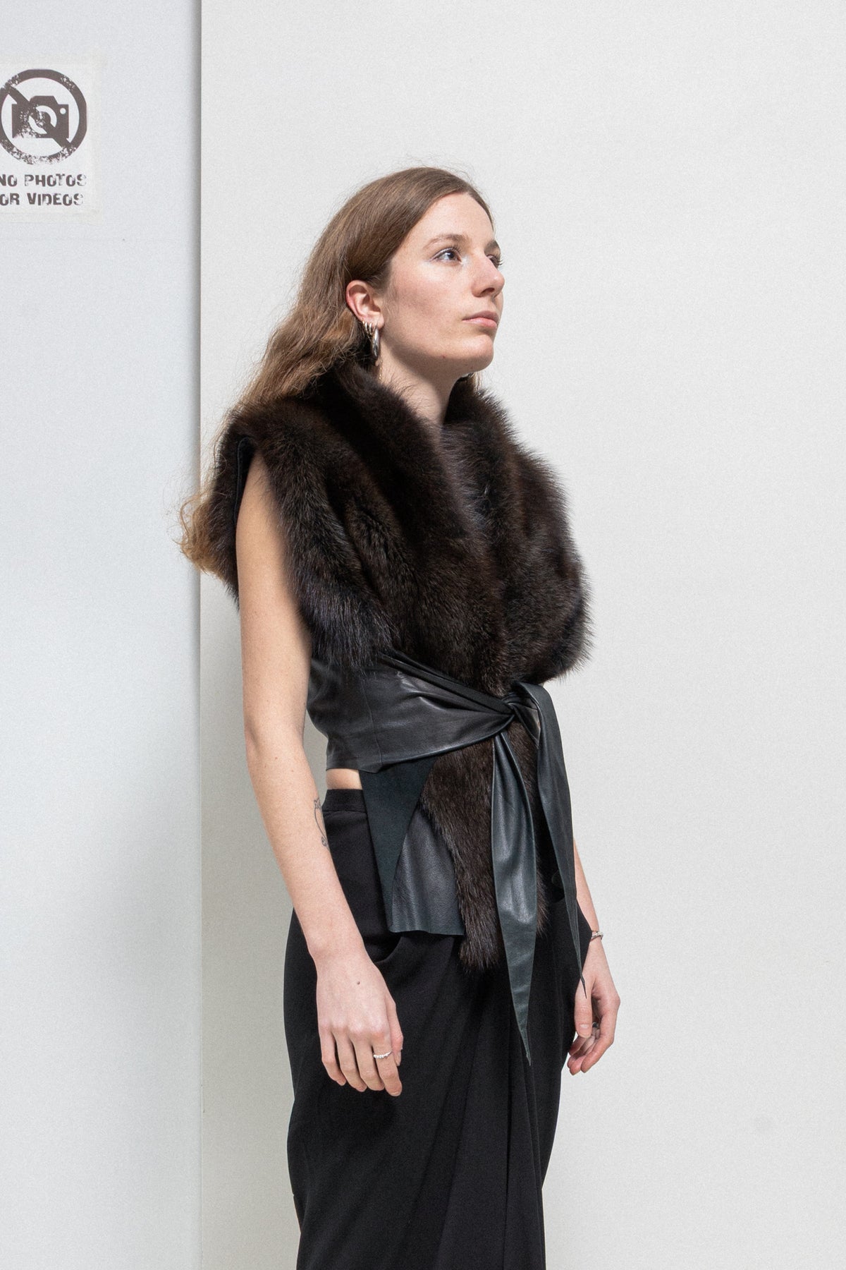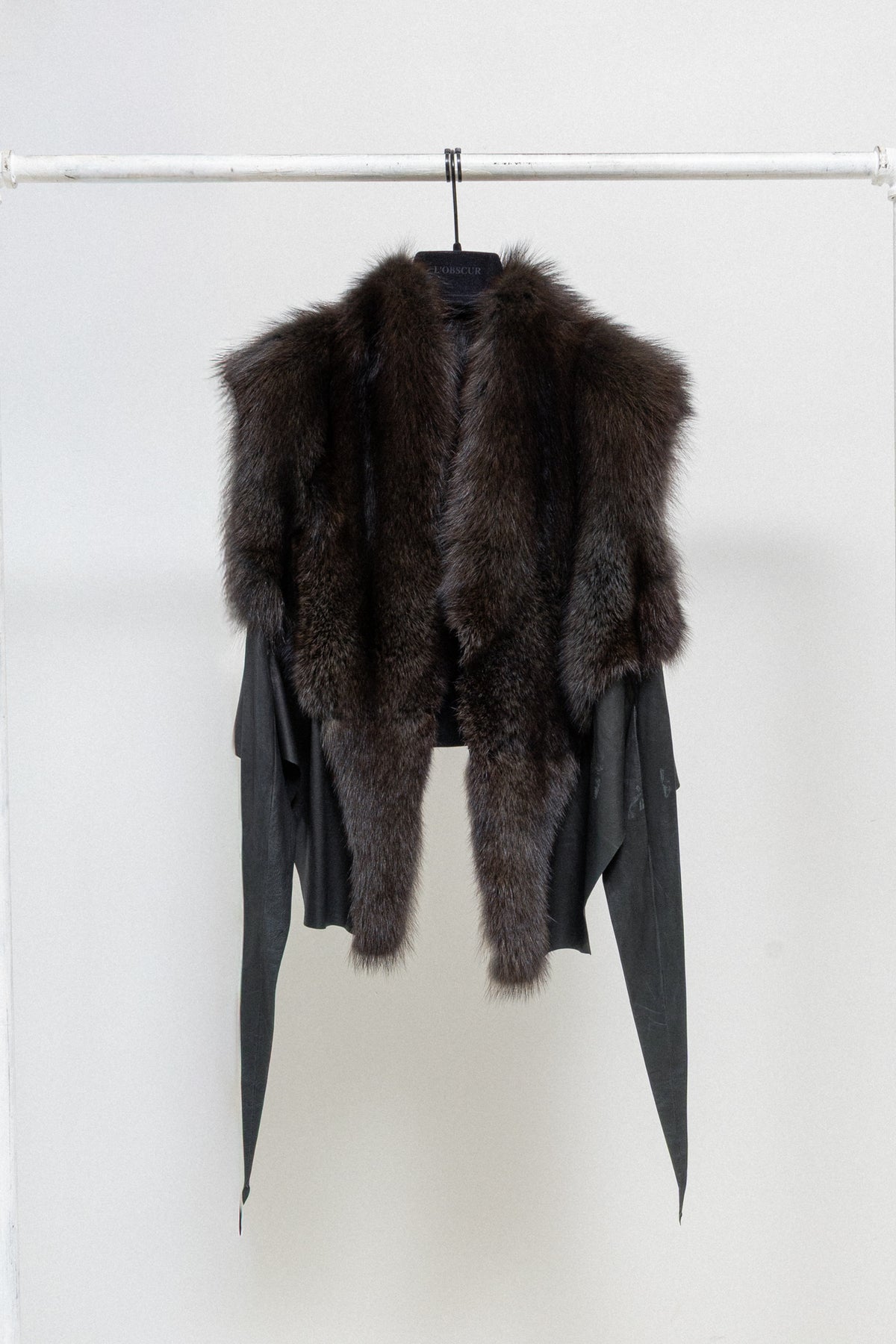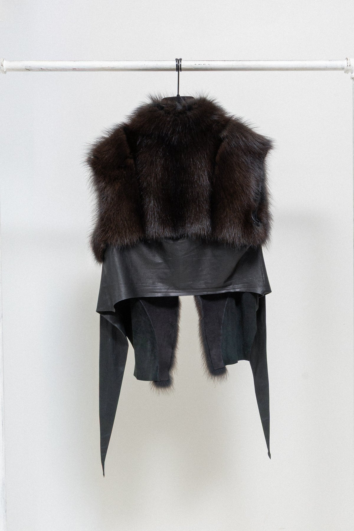 Wonderful vest made of a soft and furnished mid length fisher fur in tones of dark brown, featuring sheep leather straps and side panels. Cropped length revealing a part of the back, while sides lengthens and slims down to the hips, creating a modern and feminine silhouette. Palais royal inner plate.