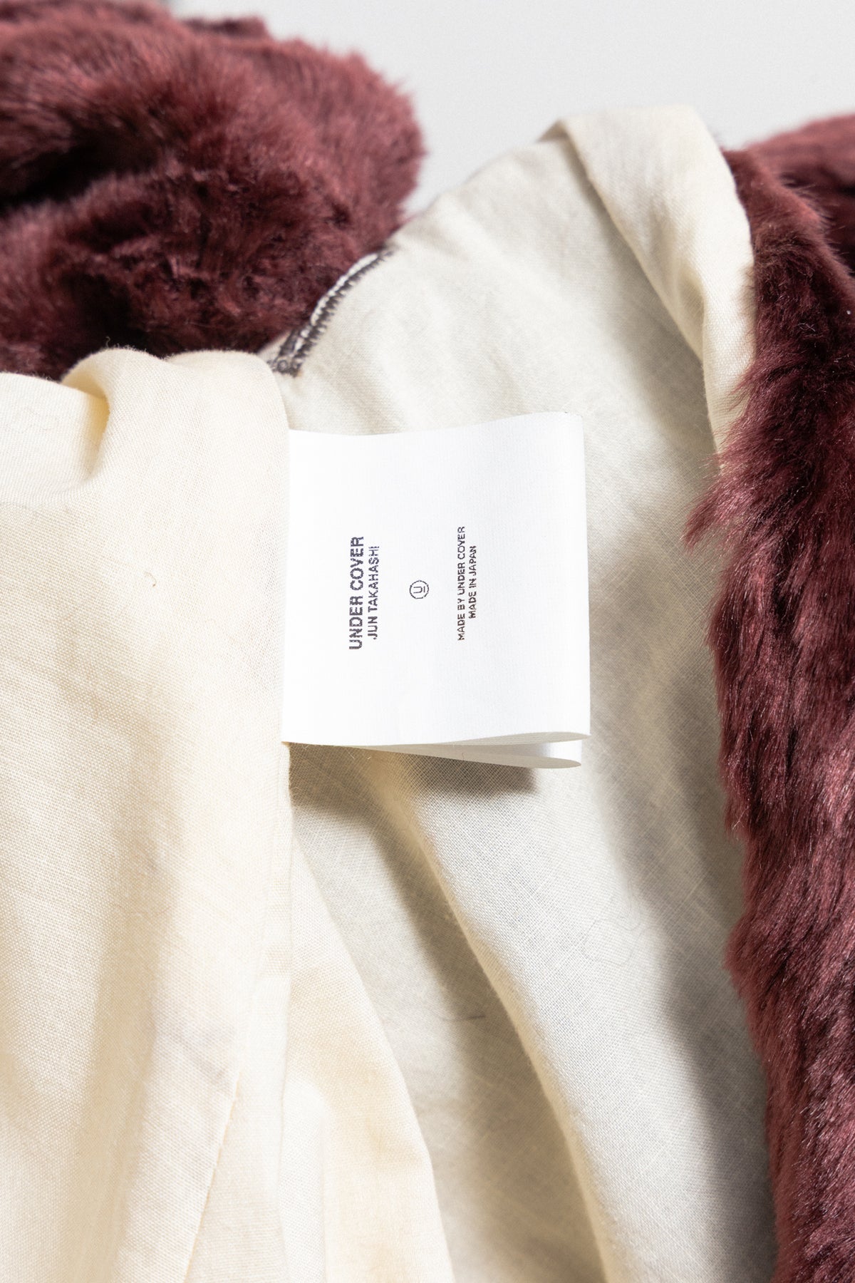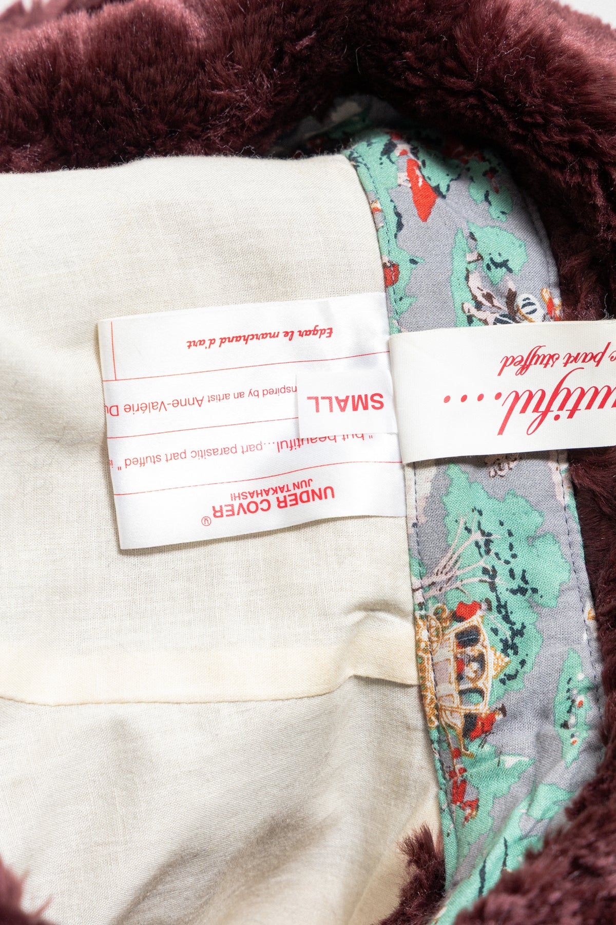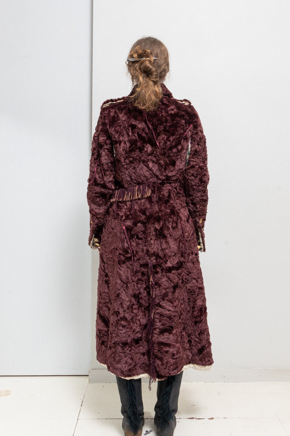 Exceptionally detailed heavy coat made of a fluffy and soft faux fur fabric in a burgundy brown color, featuring many beautiful details all over the garment such as irregularly placed piped seams, colorful mismatch linings used as panel pouches under the armpits or inside the cuffs and pockets, as well as numerous unmatching military golden buttons that can be found on the closure, shoulders and cuffs. Shoulder plackets detail. Front double-breasted closure with ten buttons. Cuff slits with six buttons. Front piped pockets with a flap on the chest. Fringes detail in the back and along the slit in the middle back. Contrasting cream body lining.